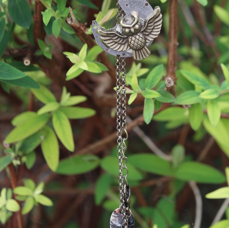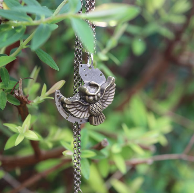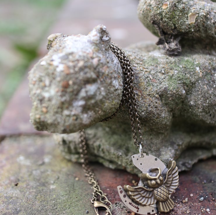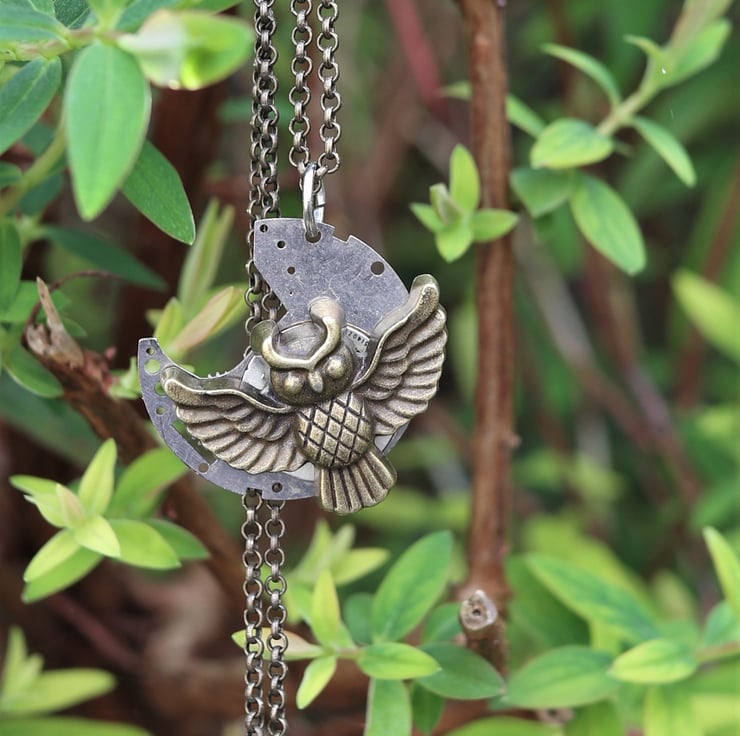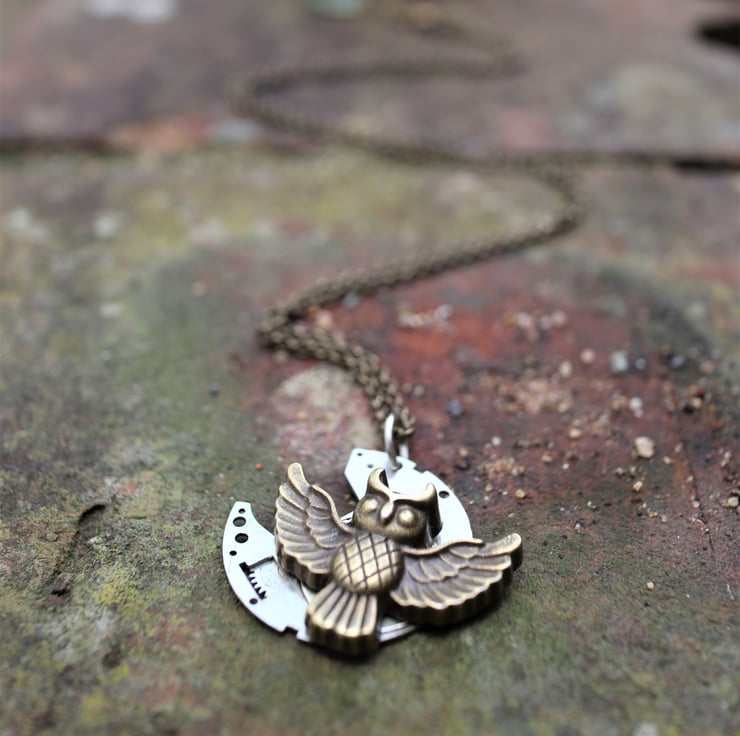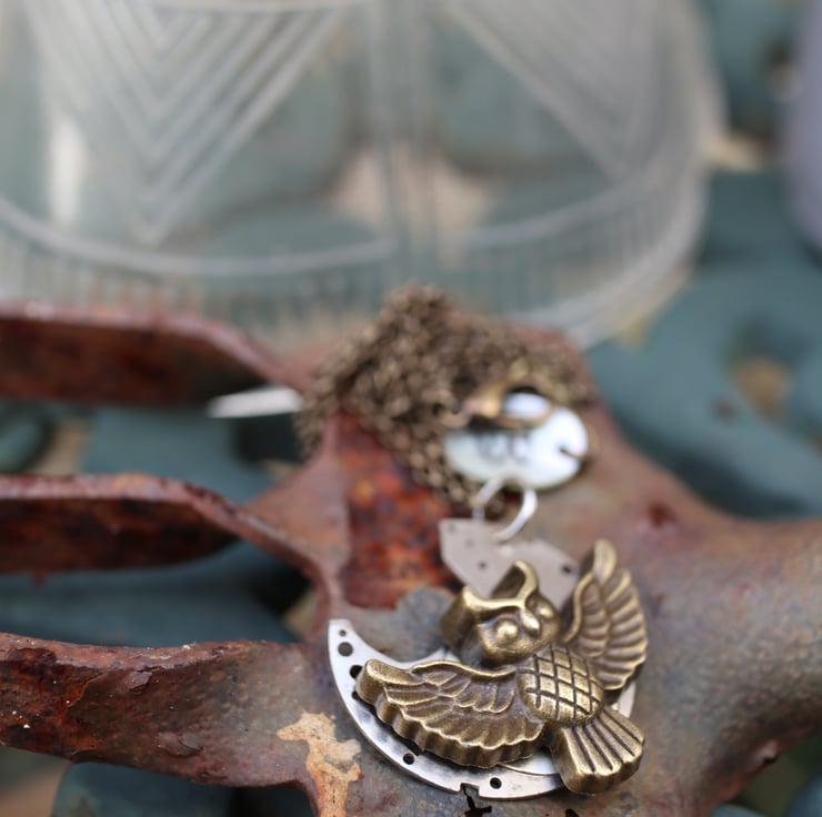 Upcycled steampunk theme - vintage watch parts - owl necklace - gift for her