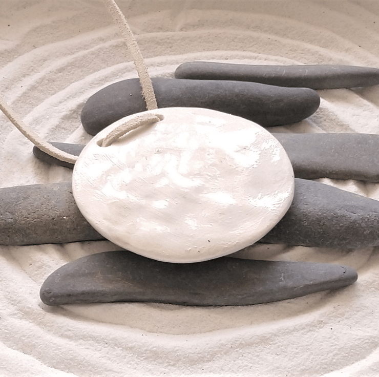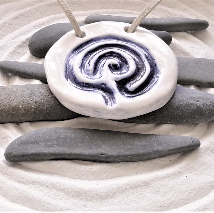 Hand-carved in clay and finished with a cobalt oxide wash and glaze, this ceramic pendant is a charming piece of jewellery and a portable mini finger labyrinth.
