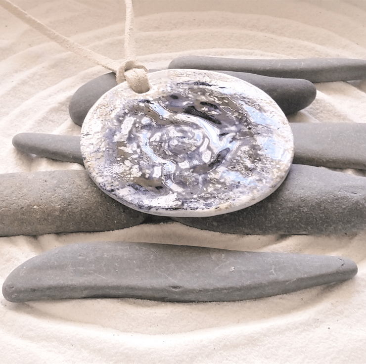 Hand-carved in clay and finished with a cobalt oxide wash and glaze, this ceramic pendant is a charming piece of jewellery and a portable mini finger labyrinth.