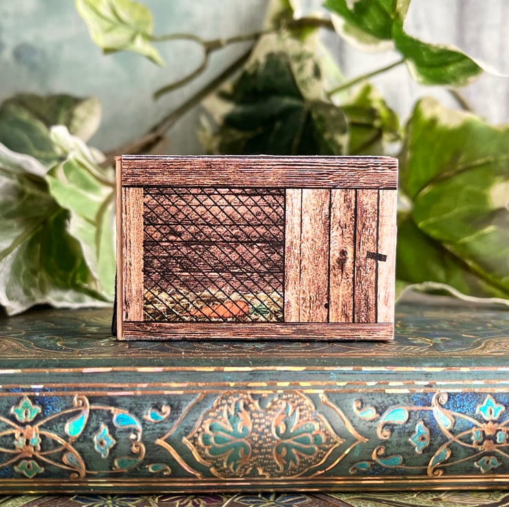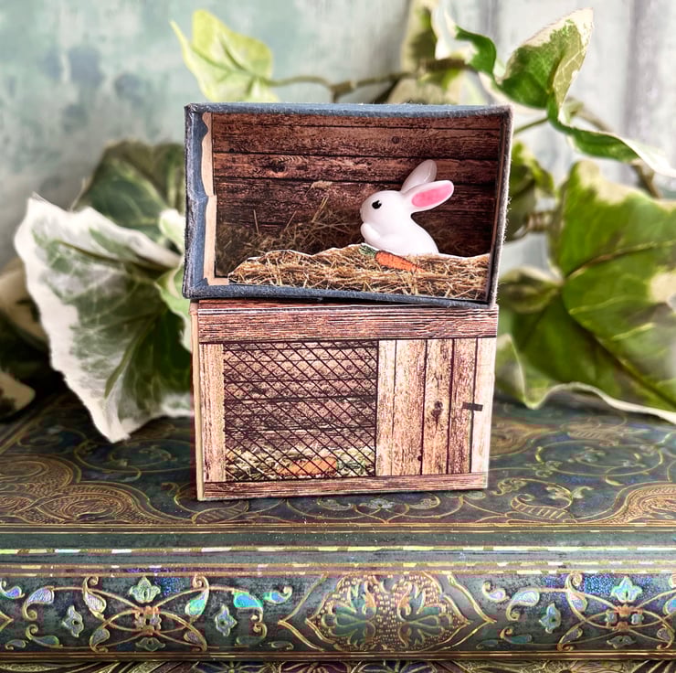 This diorama is housed inside a vintage matchbox. I've covered the top label and made the scene inside using colour paper copies backed with card. Inside is a tiny white resin rabbit.