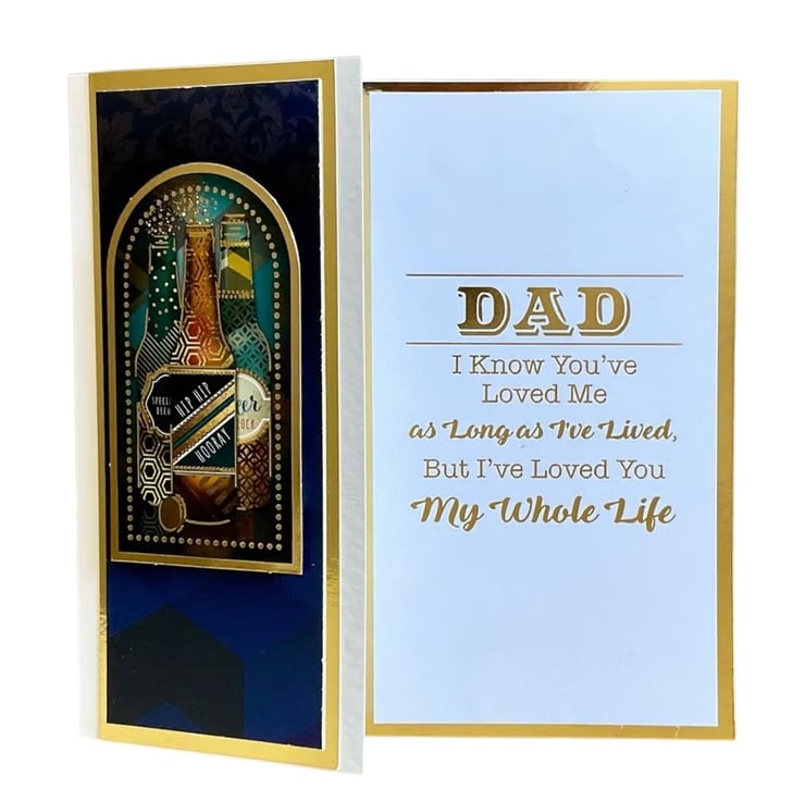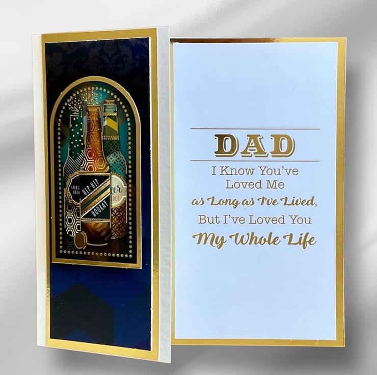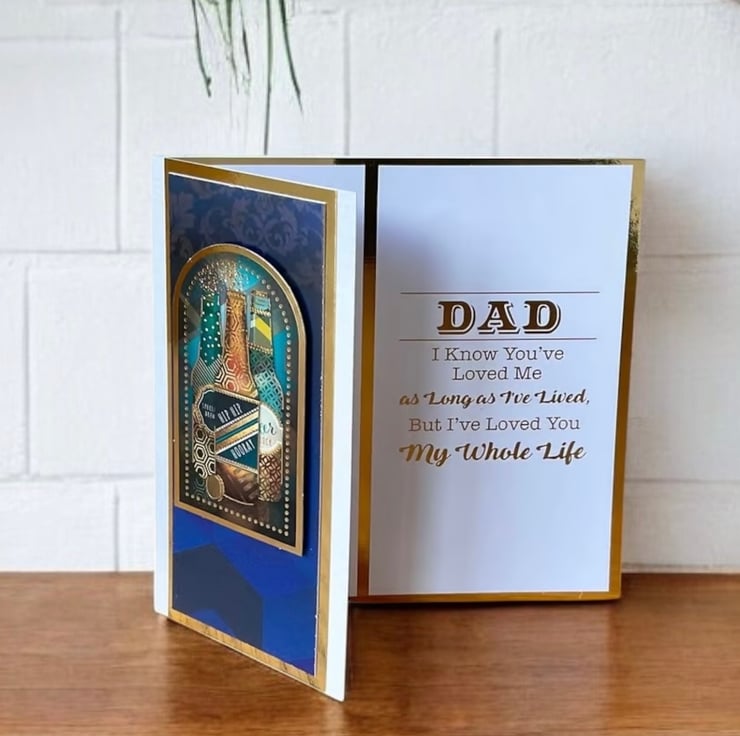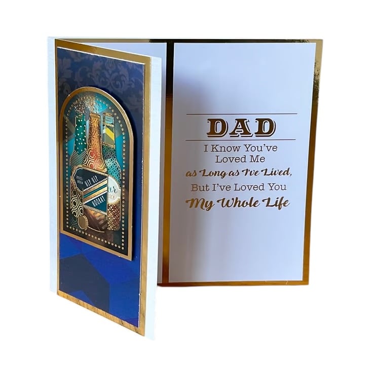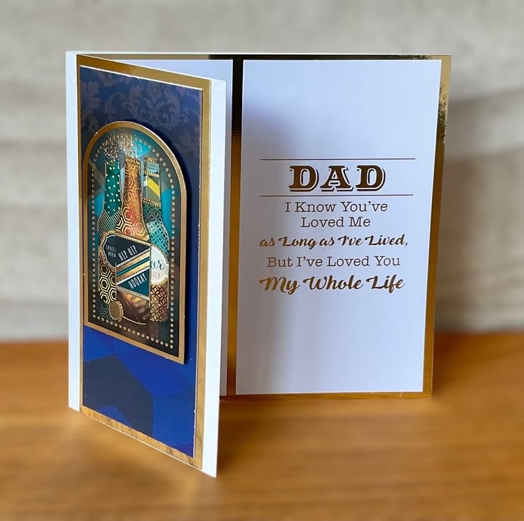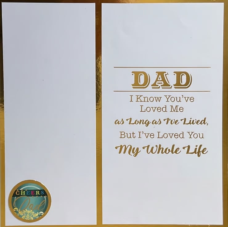 The inside of the card is layered with gold card and two white panels. One panel has the words Dad, I know you’ve loved me as long as I’ve lived but I’ve loved you my whole life. The second panel has been left blank for your own personal message and features a topper with the words Cheers Dad.