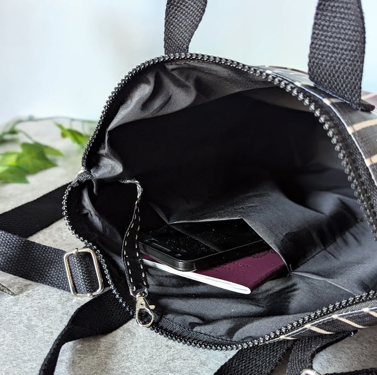 It closes by means of a chunky plastic black zip with a leather zip pull. At the back of the bag is a lined patch pocket secured with a heart shaped plastic snap closure. Inside, is a divided slip pocket for phone, pens etc. There is also a key hook on a grosgrain ribbon inside the bag, making it easy to find your keys.