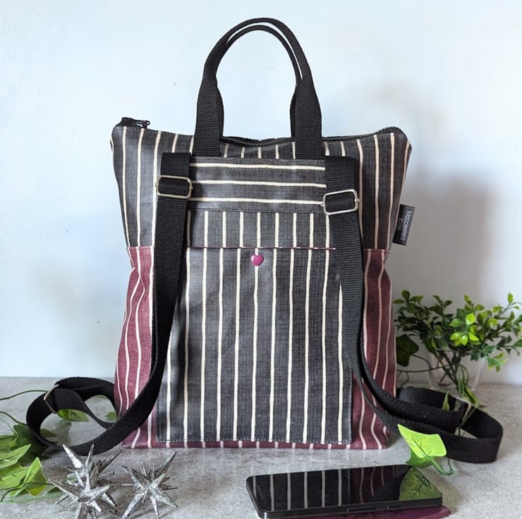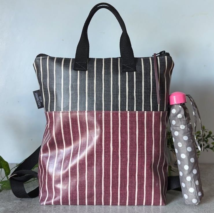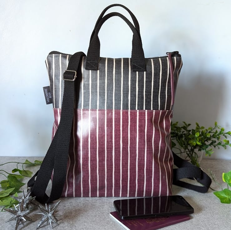 A water-resistant backpack handmade using matt oilcloth.