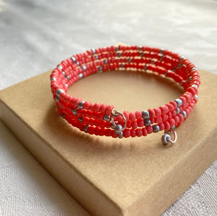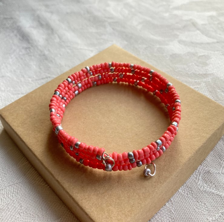 This wrap around bracelet is made with coral and grey coloured seed beads.