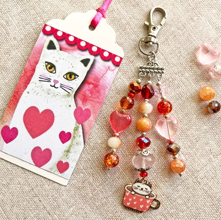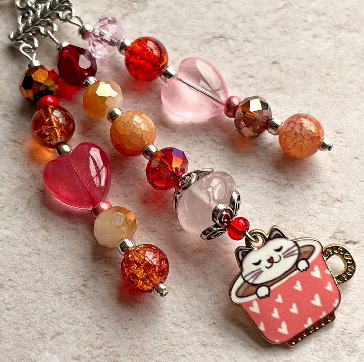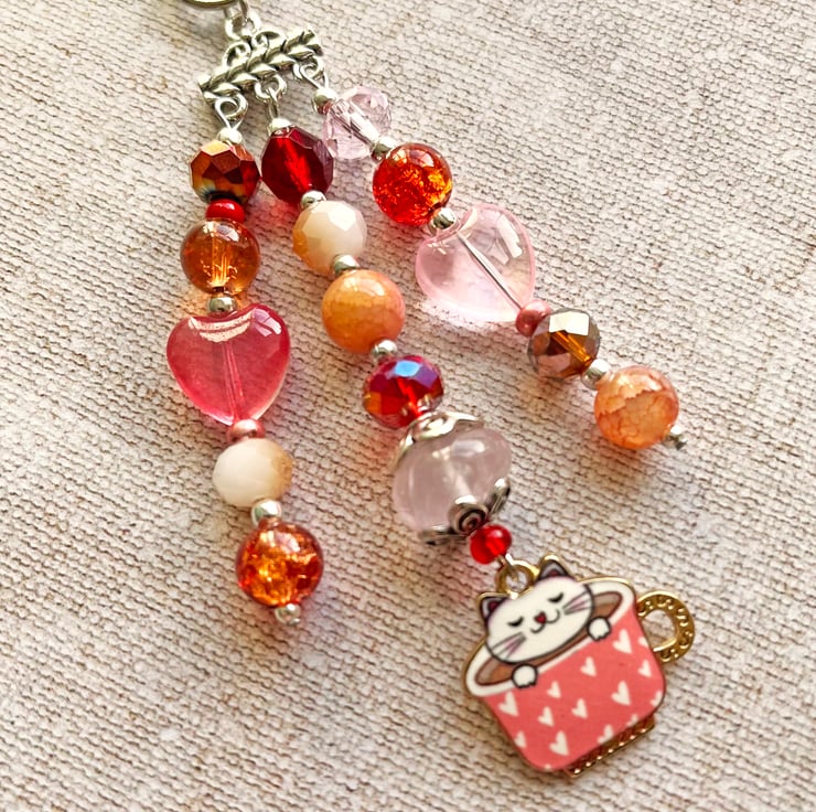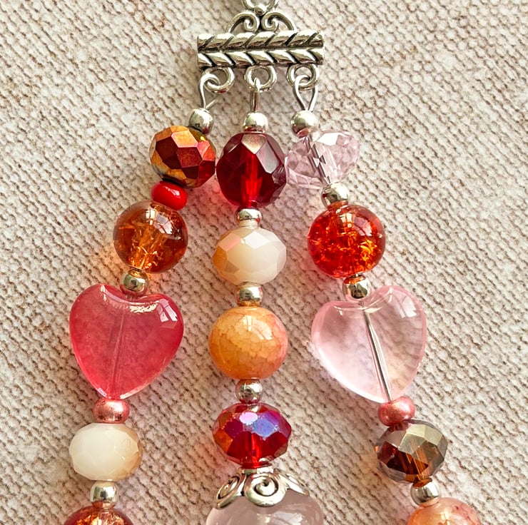 I've used a cute enamel charm and an assortment of glass beads in shades of pink and peach and a large semi-precious rose quartz freeform bead.