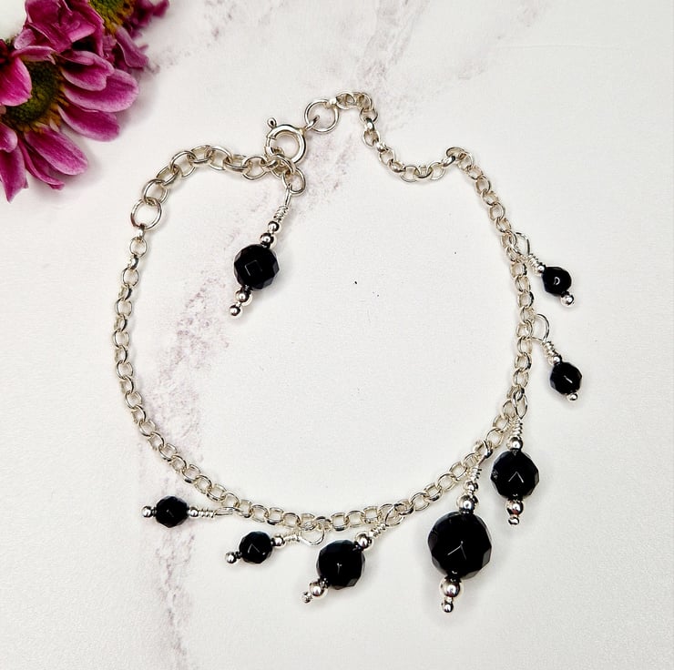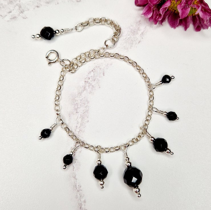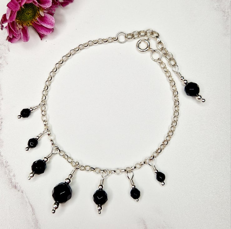 The bracelet is made of 4, 6 and 8 mm faceted black onyx round beads, they are a solid black with a high polish and even facets. The beads are placed on a beaded head pin with 2 and 3 mm silver beads and wire wrapped onto the chain, so they are fixed in place.