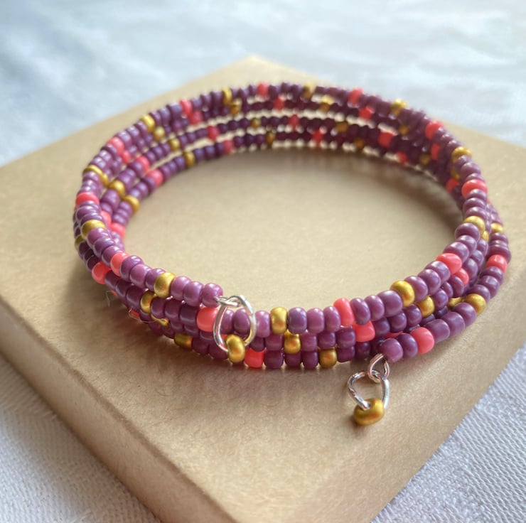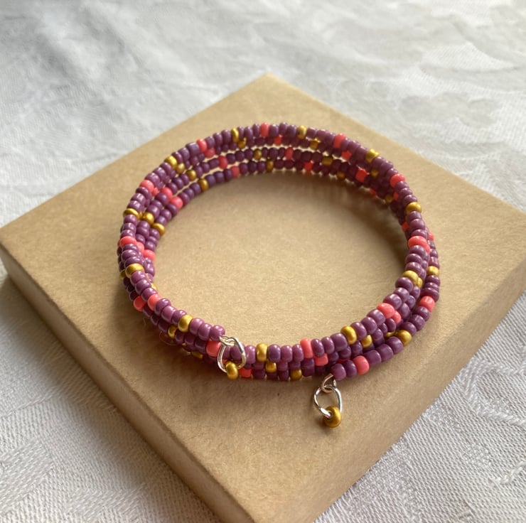 This wrap around bracelet is made with burgundy, gold and coral coloured seed beads.