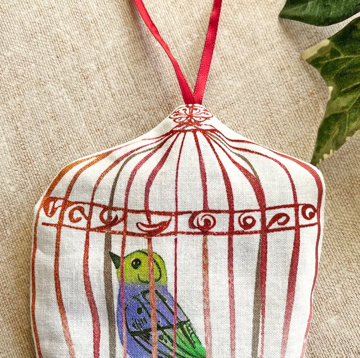 The design has been printed onto 156gsm cotton fabric with plain white on the reverse. The burgundy ribbon loop is approx 10cm.