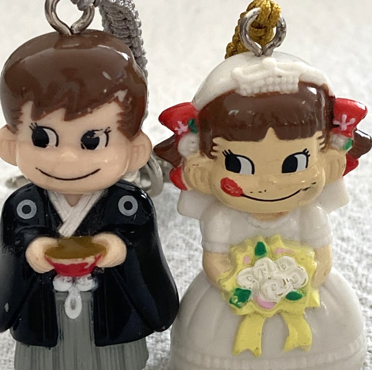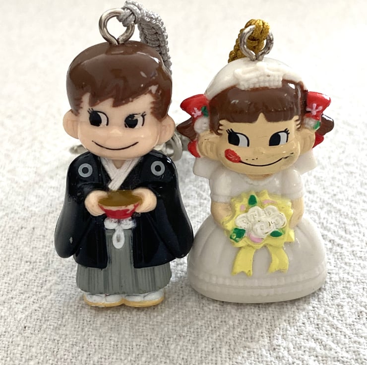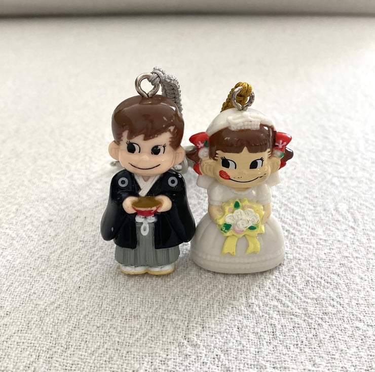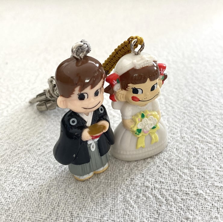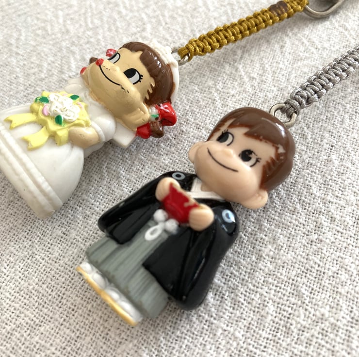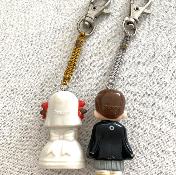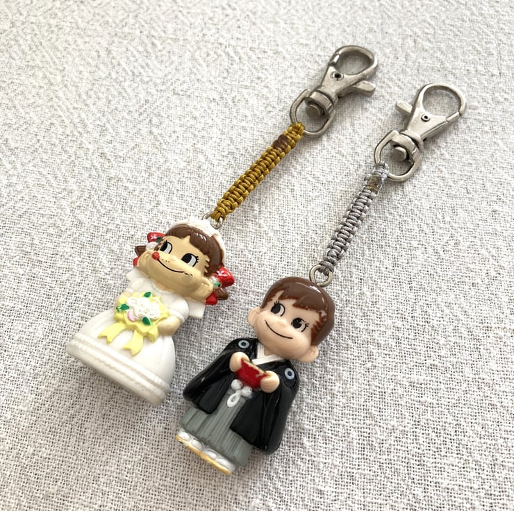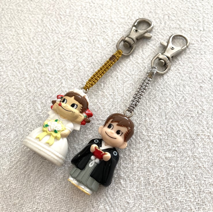 Upcycled Handmade Couple Keychain - Bandai Genuine Gashapon Fujiya Milk Girl In Wedding Dress And Man In Japanese Costume Peko Keychain - Handmade - gift for him - unique gift