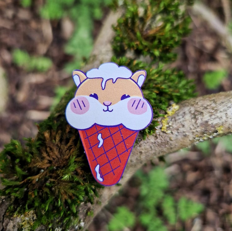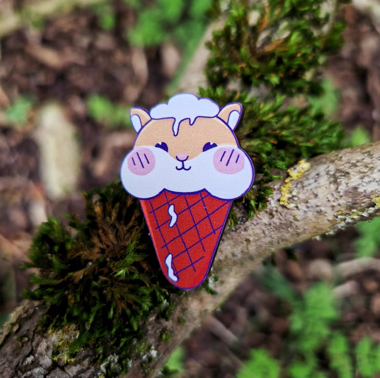 A hamster pin made from UK FSC wood, with a choice of metal or rubber backing and posted in zero plastic. Perfect for gifting or keeping for yourself, this adorable hamster pin looks amazing on beanies, jackets and more!