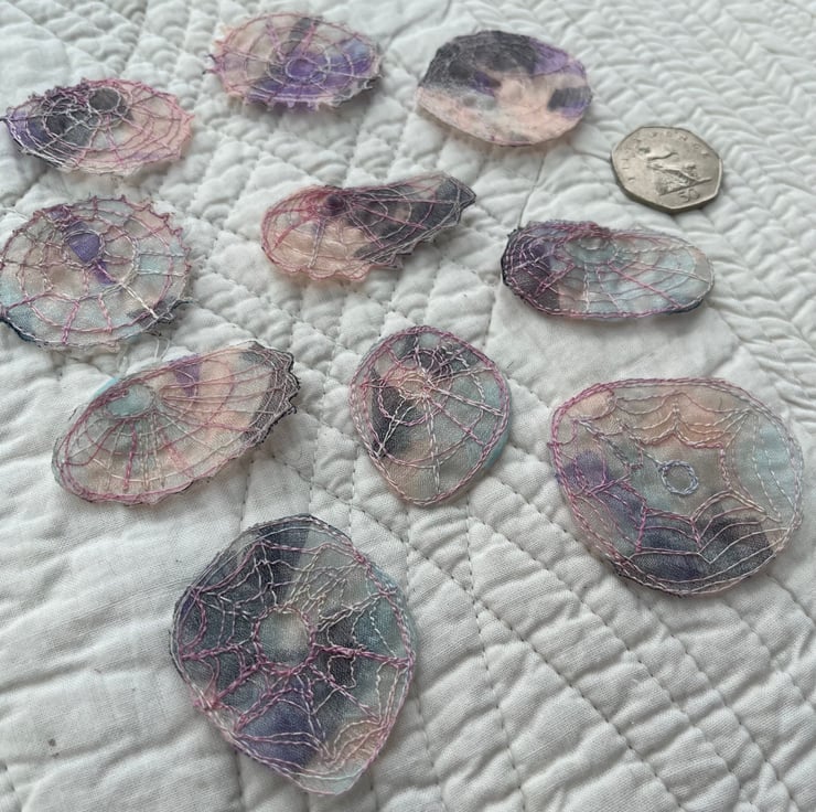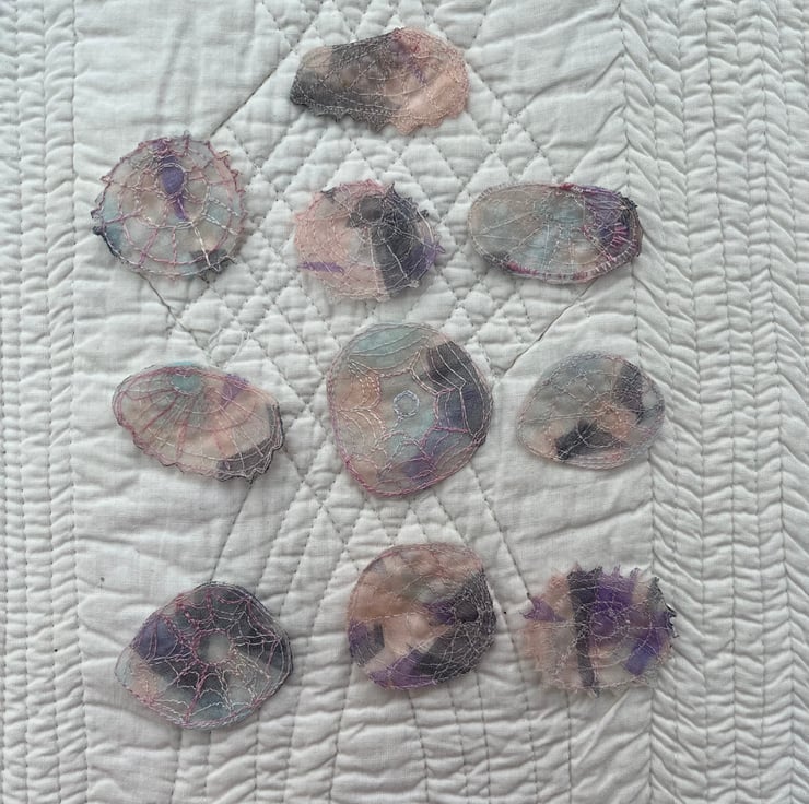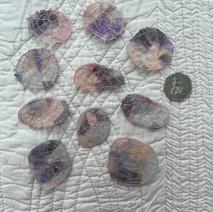 This pack of 10 shell embellishments have been made by using free motion embroidery techniques - drawing with the sewing machine. Each one is slightly different from another, giving them a quirky, individual look.
