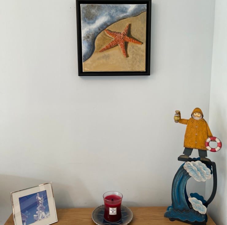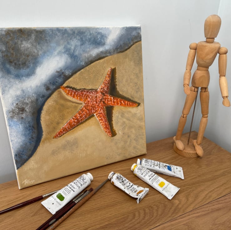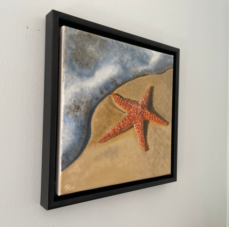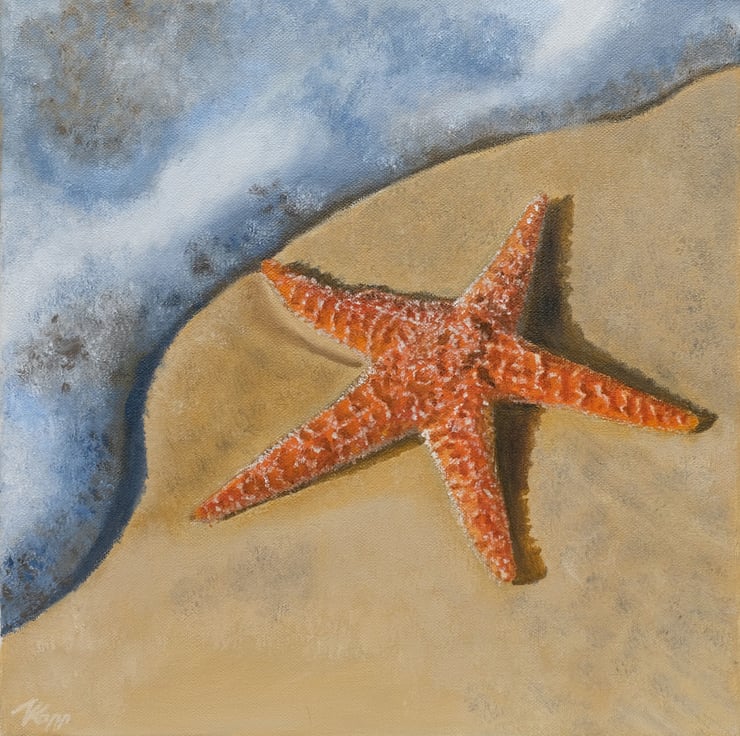 An original oil painting of a bright orange starfish nestled on golden sand. The edge of a foaming wave sweeps in from one corner, ready to envelop it.