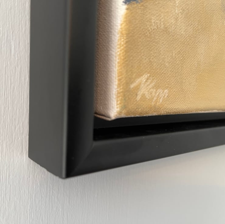 The painting has been varnished, and sits on a stretched canvas measuring 30cm x 30cm. It can be provided without a frame or provided mounted in a black floating frame from which the canvas can be removed if required. The frame size is 34.2 x 34.2 x 3.4cm. Also known as a tray frame, the canvas sits in the middle of the frame with a 5mm gap between the canvas and the frame. It is not glazed.
