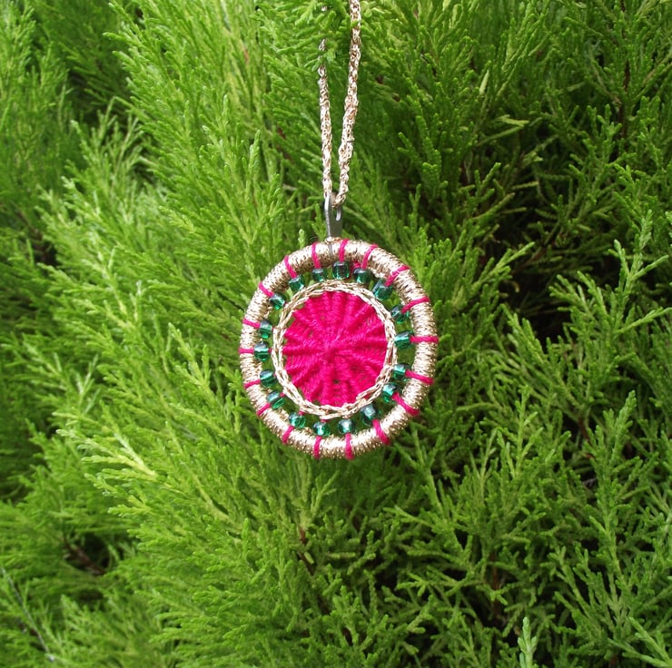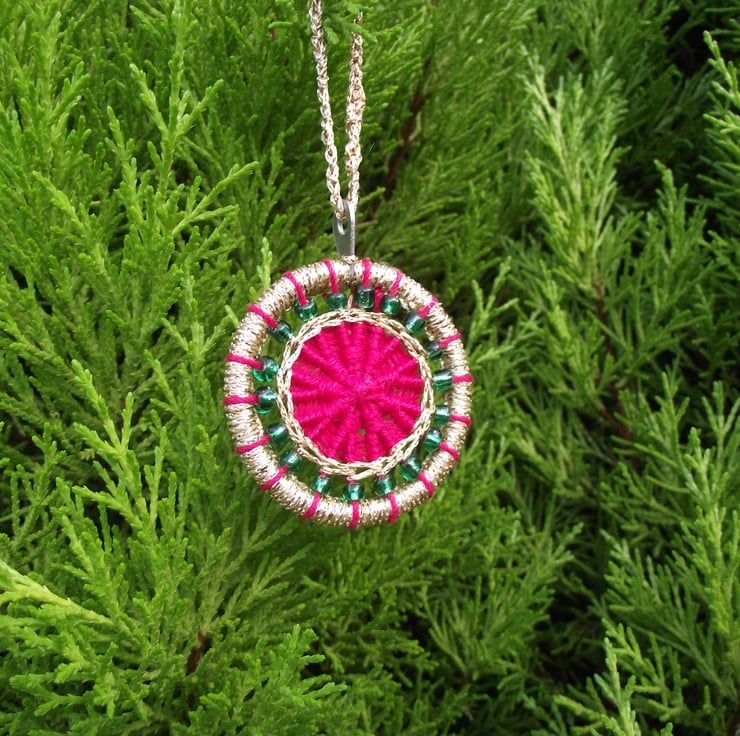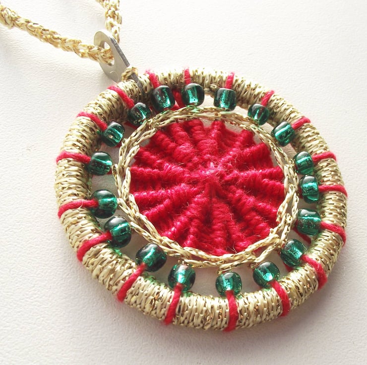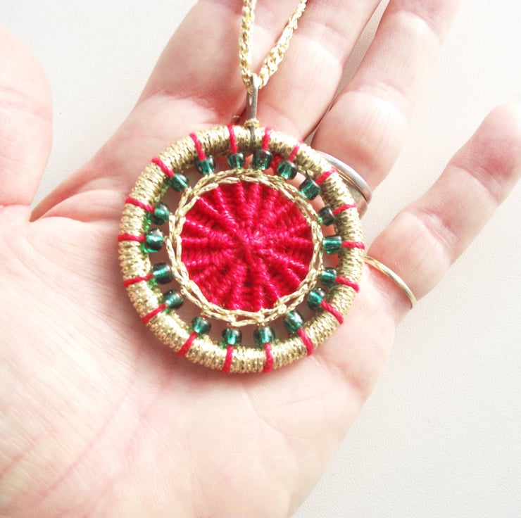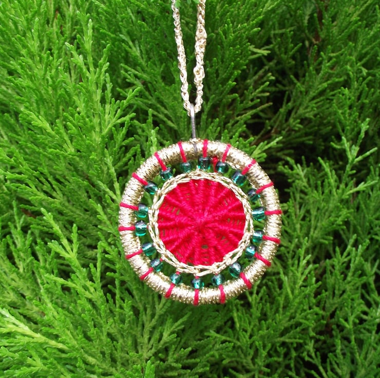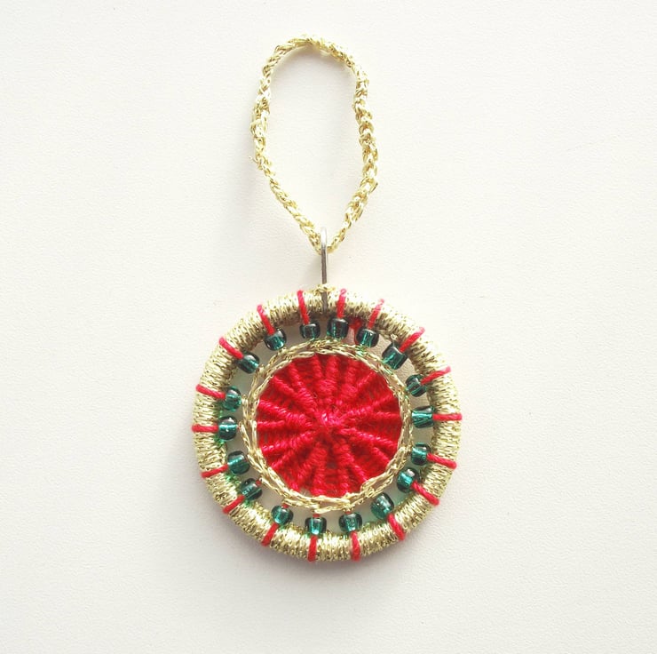 I made this unique Christmas tree decoration using the traditional Dorset button technique, intricately working red cotton and gold metallic threads around a repurposed metal curtain ring. I have also included green glass beads. I added a hanging loop in the gold thread.