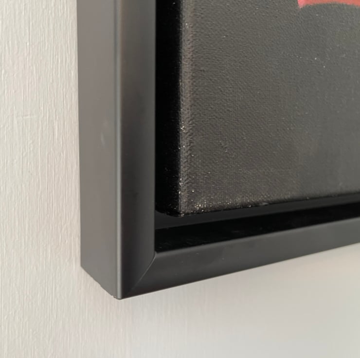 The painting has been varnished, and sits on a stretched canvas measuring 30cm x 30cm. It can be provided without a frame or provided mounted in a black floating frame from which the canvas can be removed if required. The frame size is 34.2 x 34.2 x 3.4cm. Also known as a tray frame, the canvas sits in the middle of the frame with a 5mm gap between the canvas and the frame. It is not glazed.