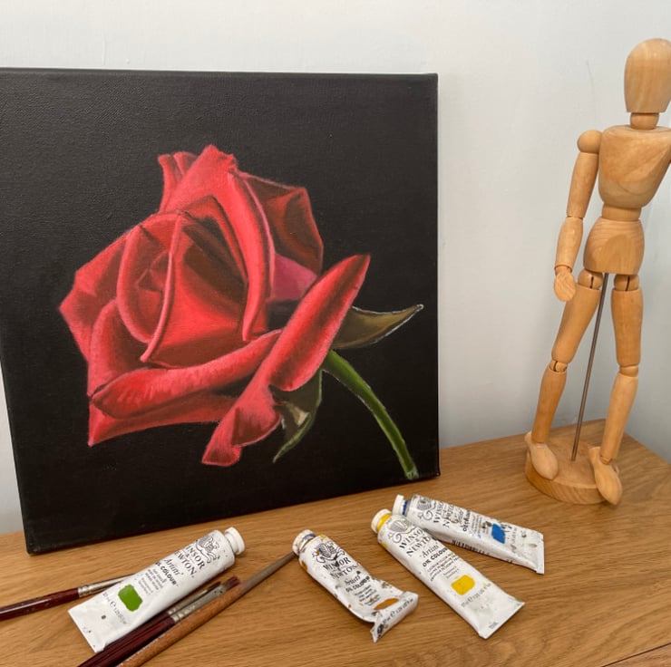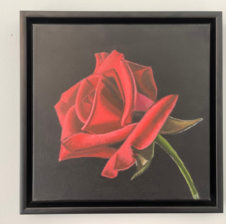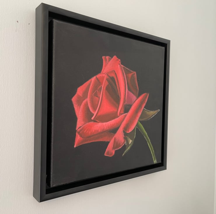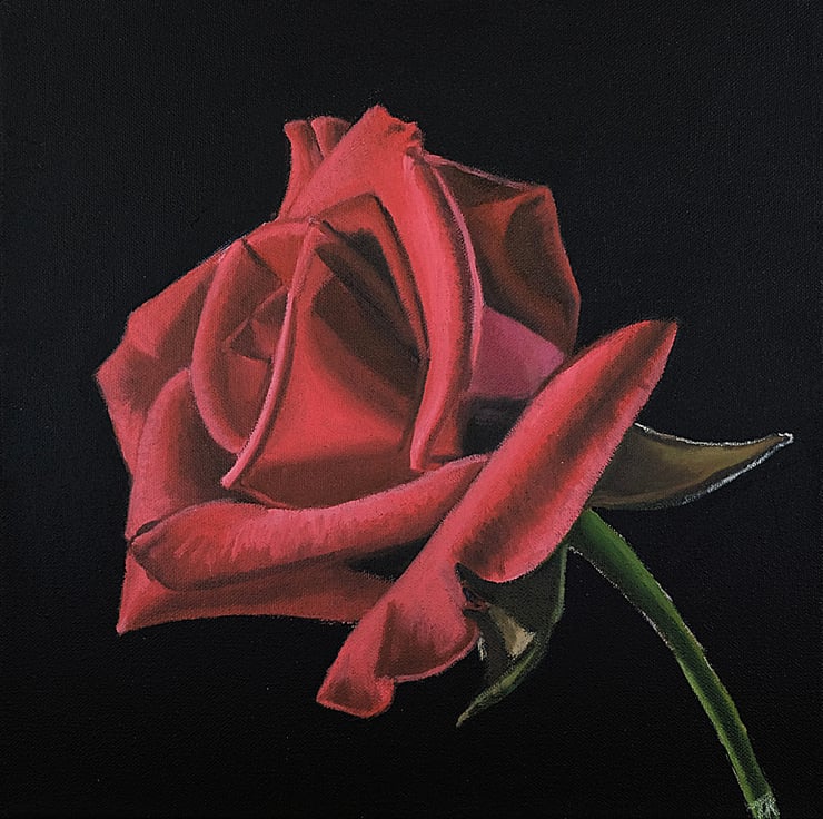 This beautiful red rose was a joy to paint, it's deep red colours lush and vibrant against the deep black background.