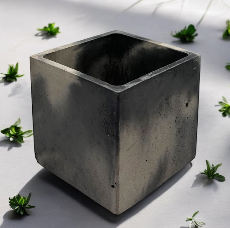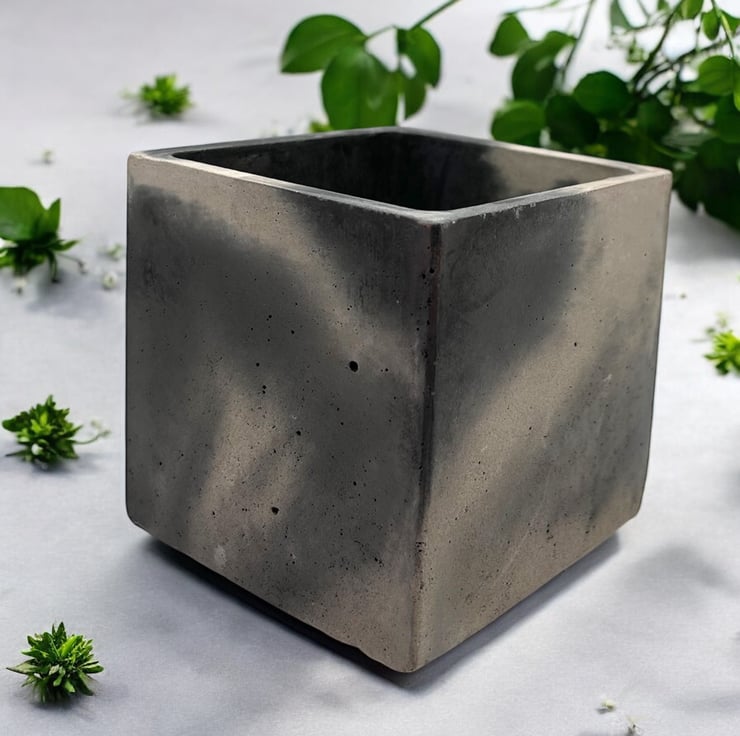 I handcrafted this cube-shaped marbled plant pot in my small home studio in Standish. It is made from high-quality Portland cement and sand, which gives it its grey colour. The black marbling was achieved by adding a cement pigment to the mix. Its neutral colour makes it an ideal gift and allows it to fit into most interior design schemes. The marbling effect is what makes this pot a truly unique piece, as no two pots ever come out the same.