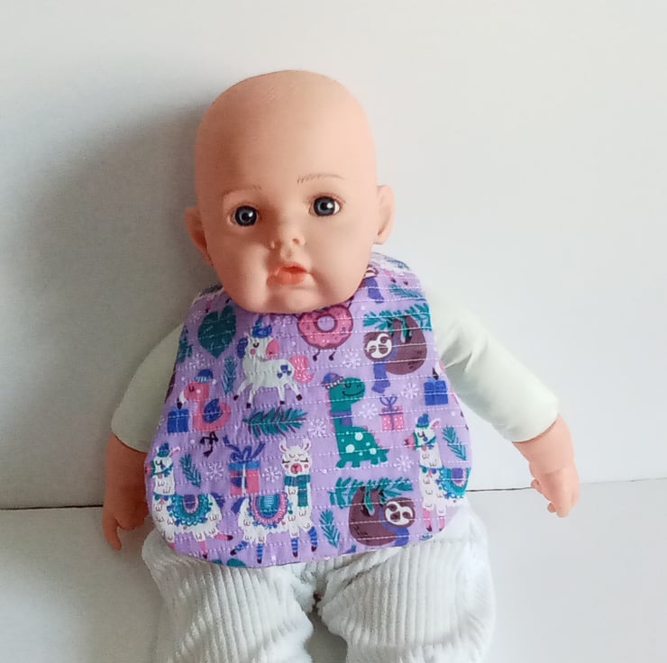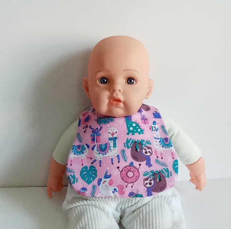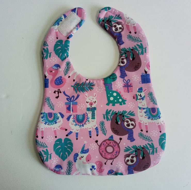 This bib is quilted and reversible one side featuring llamas, unicorns, sloths, flamingos, dino's and doughnuts and the same design on the other side in pink with a cotton batting centre.