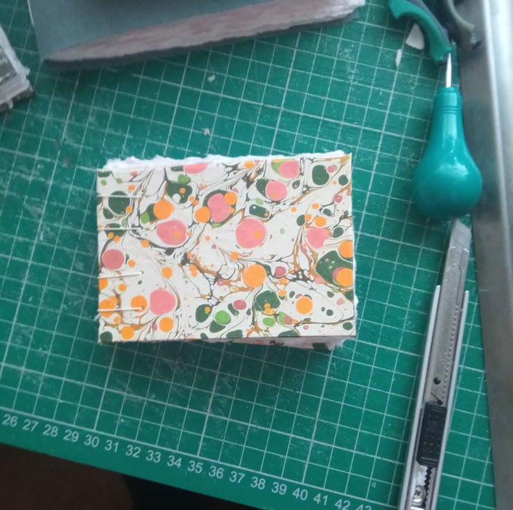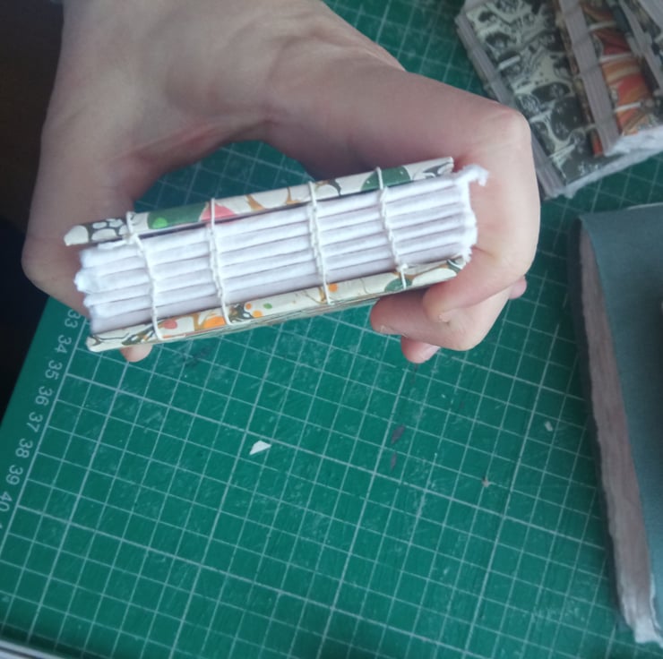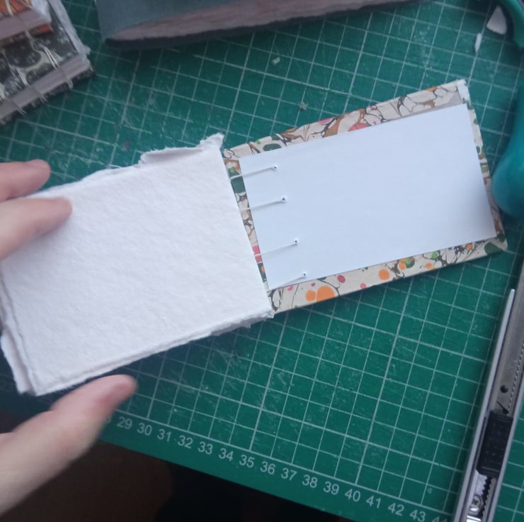 Mini A7 landscape Coptic sketchbook with Indian cotton rag paper.
