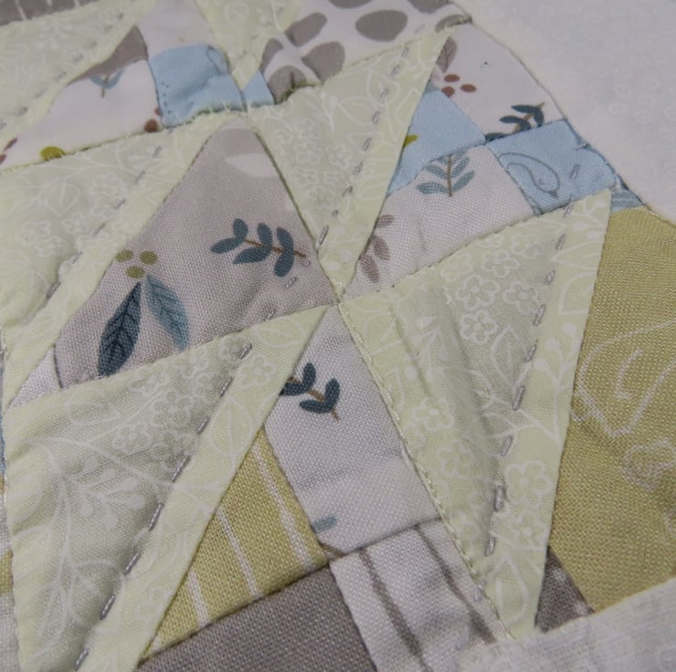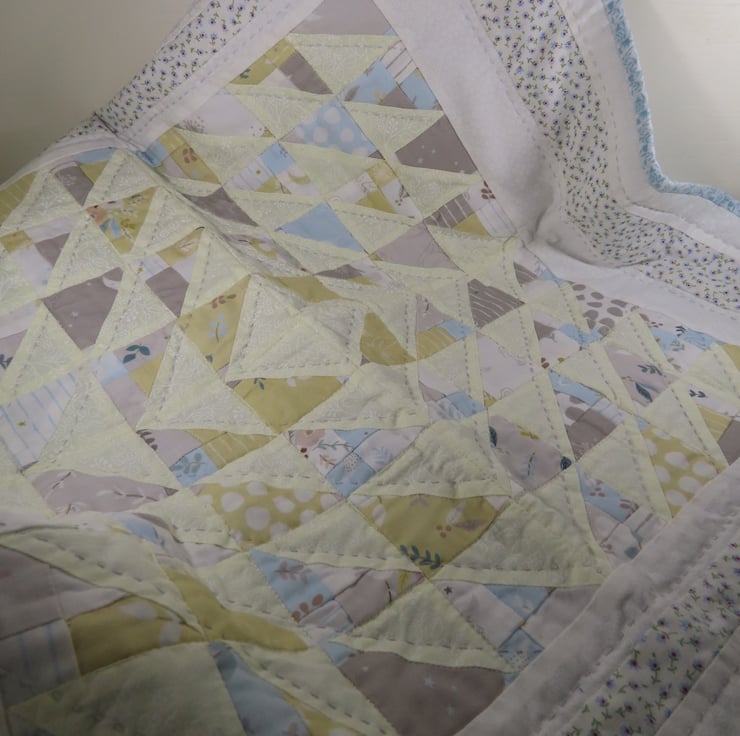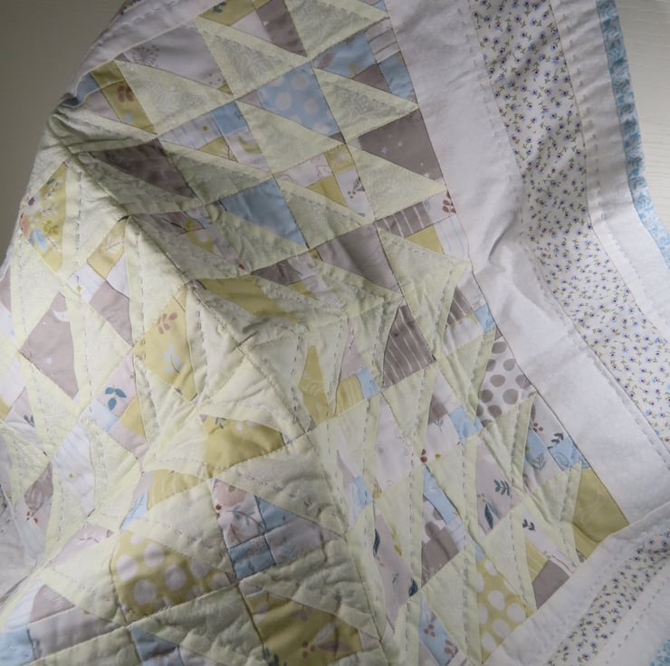 The quilt has been both machine quilted and lovingly hand quilted in a silver, grey Perle thread. The quilt is made to last, is machine washable at temperatures up to 40 degrees and can be tumble dried.