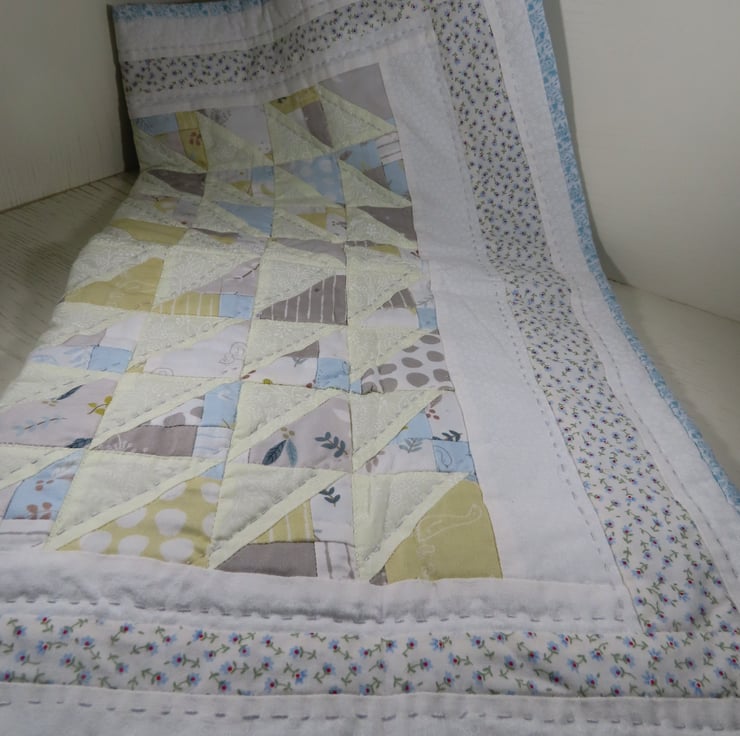 This adorable, bespoke, crib quilt is made from 100% cotton fabric. The fabric is 'Little Ducklings' by Moda. The colours are lovely soft pastels in blue, lemon and grey. It is very gender neutral.