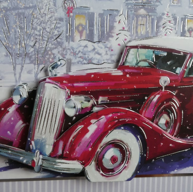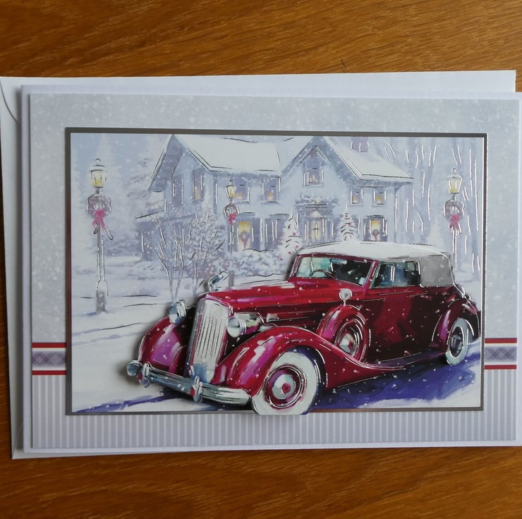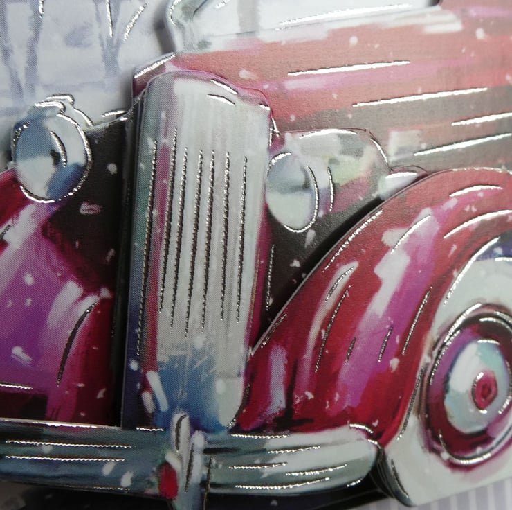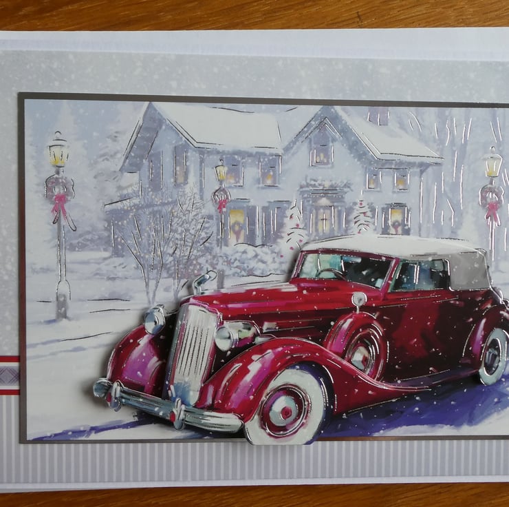 The central rectangular card topper has a background image of a snowy Christmas village scene with a red vintage car in the front which has been decoupaged in several layers of card with foam pads to raise it from the card front. Both the topper and the car have details highlighted with silver foil.
