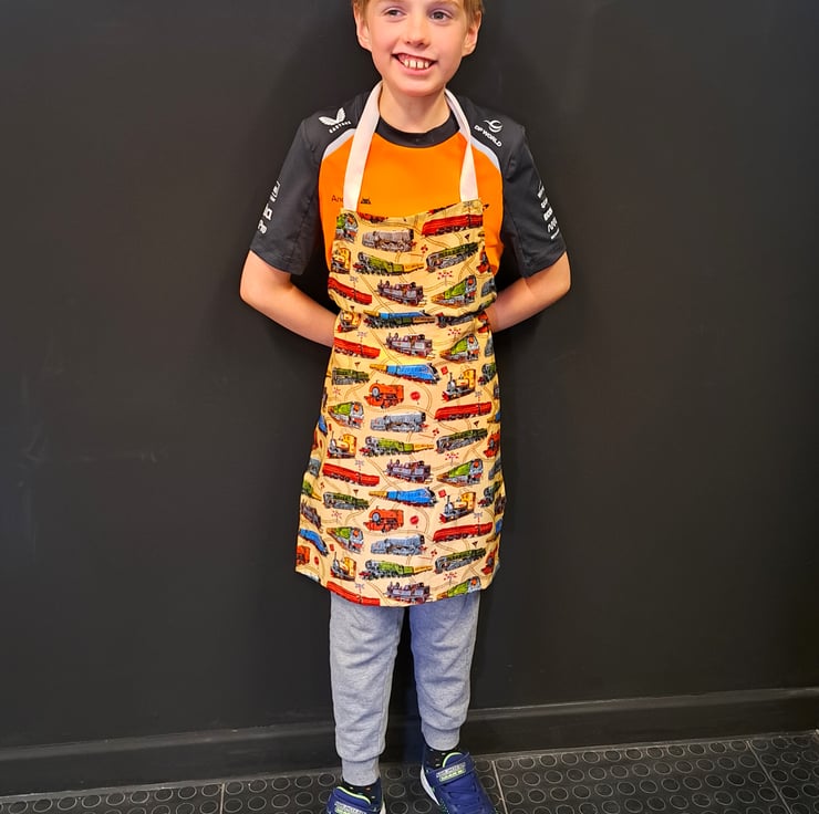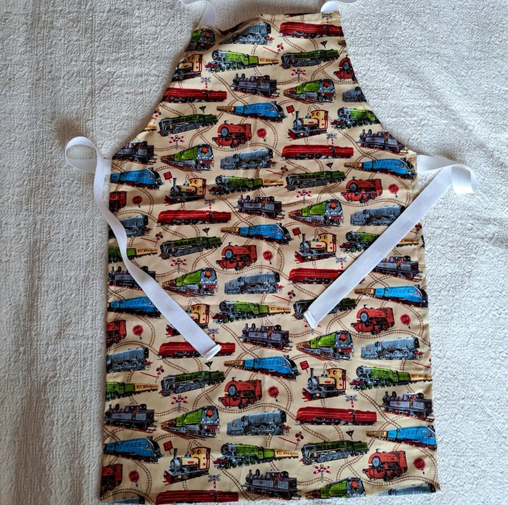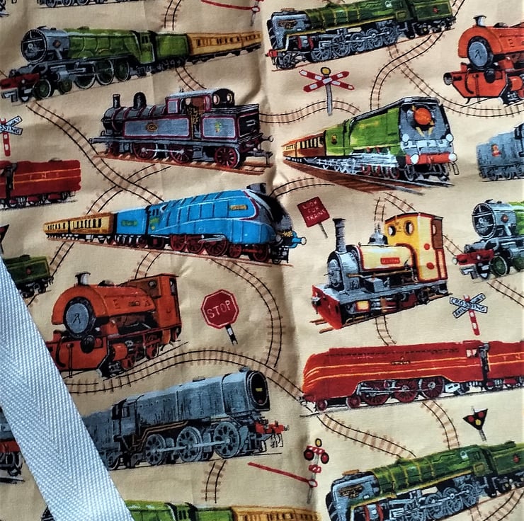 This is a lovely tan pinny with realistic British steam engines scattered over it, against a background of railway tracks and signs. (The engines may not appear in the same positions as in the illustration.) I have made it of a good quality machine washable cotton, with acrylic webbing straps. It measures approximately 28" (71 cm.)from neck to hem, and 18" (46 cm.) at the widest point, and will fit a child from about 10 years up to a small adult.