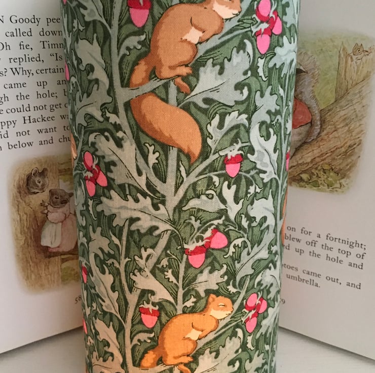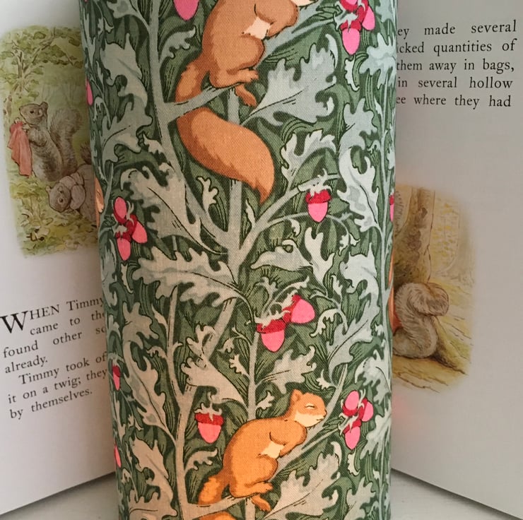 Such a delightful print featuring sleeping Squirrels on a sage Acorn cotton fabric. Night Light looks simply lovely lit up.