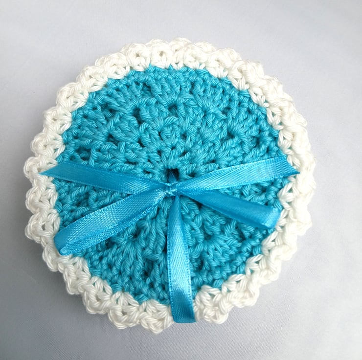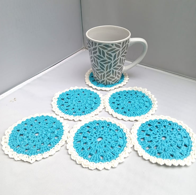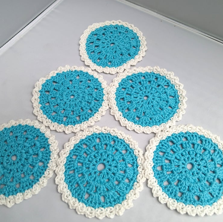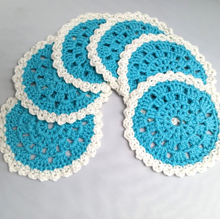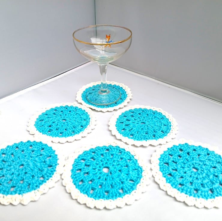 Coasters Crochet Set of 6 in Turquiose and White. Crocheted on 100% cotton yarn. Diameter approx 3.75"