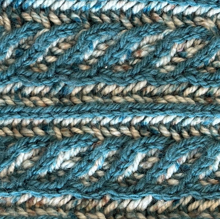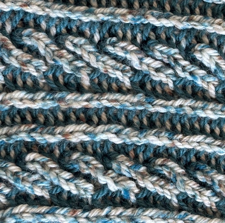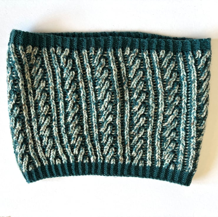 Reversible cowl knitted in 2 coloured brioche technique. 2 lovely colours of West Yorkshire Spinners - The Croft Shetland Colours & Shetland Tweed have been brought together in this glorious knit.