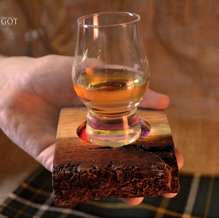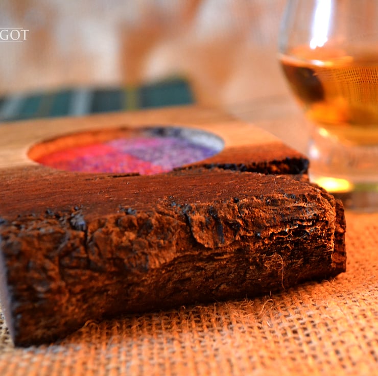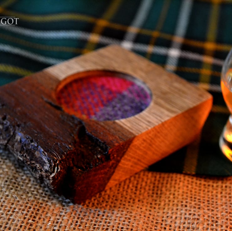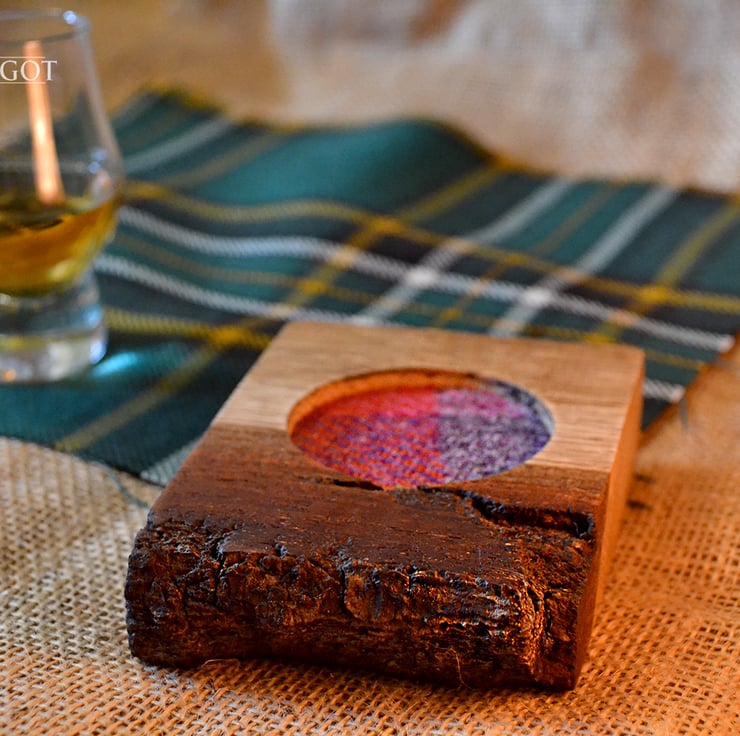 This tiny whisky coaster has been made with handcut oak and a genuine Scottish Harris Tweed cotton glass pad, sealed with natural wax to maintain the wood’s natural beautiful colours.