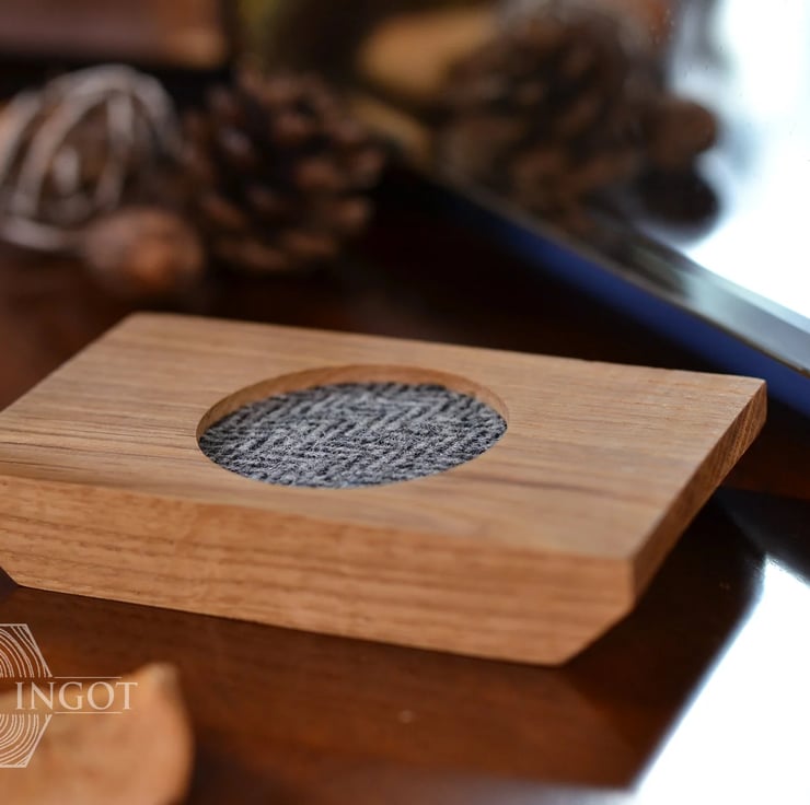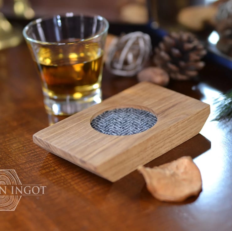 This tiny whisky coaster has been made with handcut oak and a genuine Scottish Harris Tweed cotton glass pad, sealed with natural wax to maintain the wood’s natural beautiful colours.