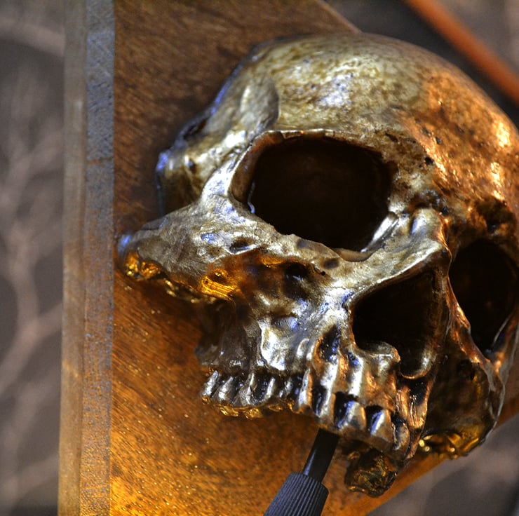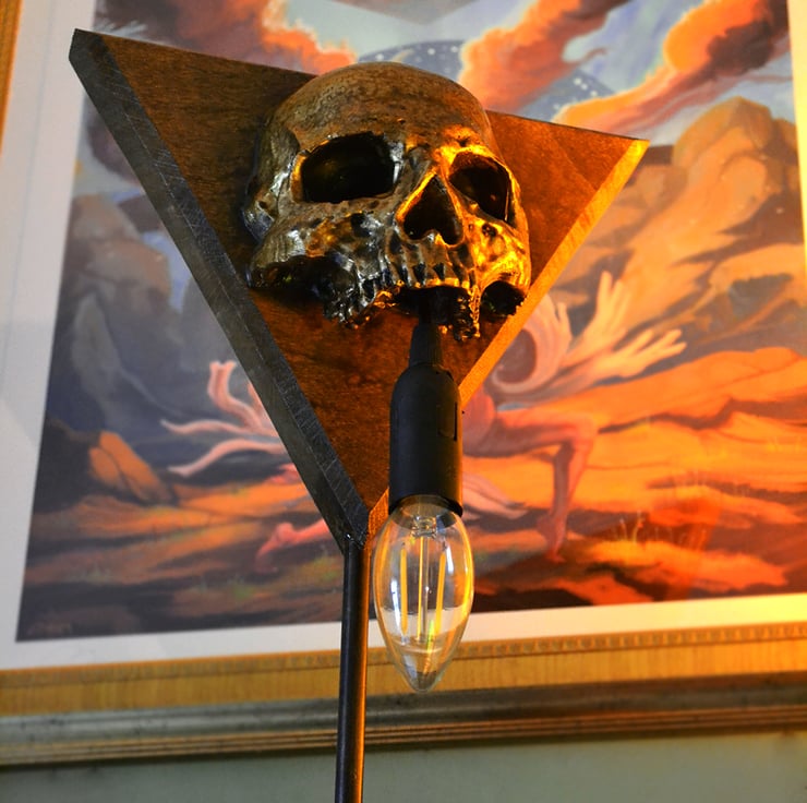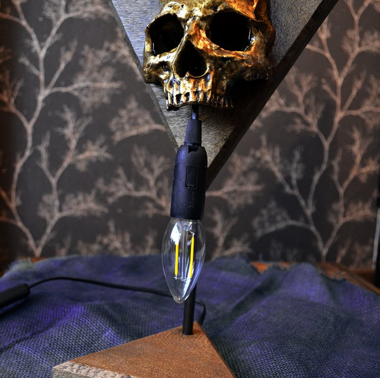 This is a wooden Trine Skull desk lamp. The oak is hand-cut and finished with a dark stain, displaying a bronze-tone cast resin skull and mounted upon a sturdy steel stand. This lamp comes with one LED vintage-style small Edison bulb .