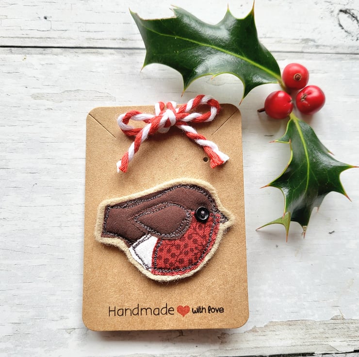 Beautiful handmade Little Robin Brooch made using freemotion machine sewing and appliqued fabric onto felt. Finished with a tiny button eye.