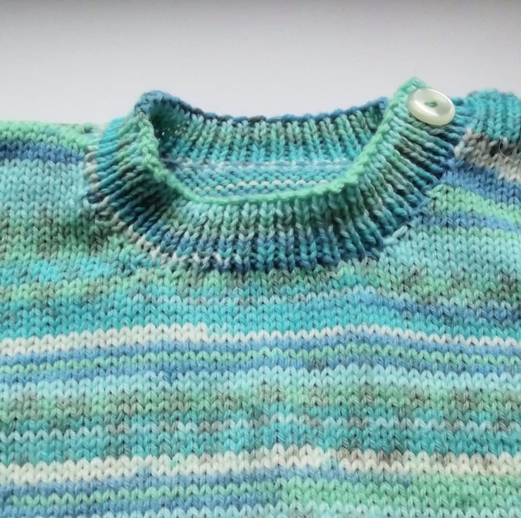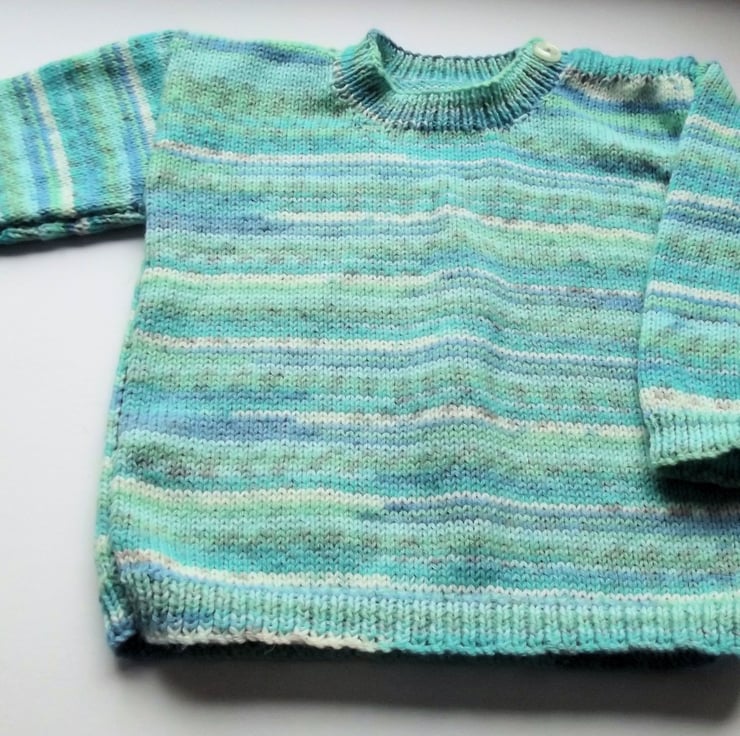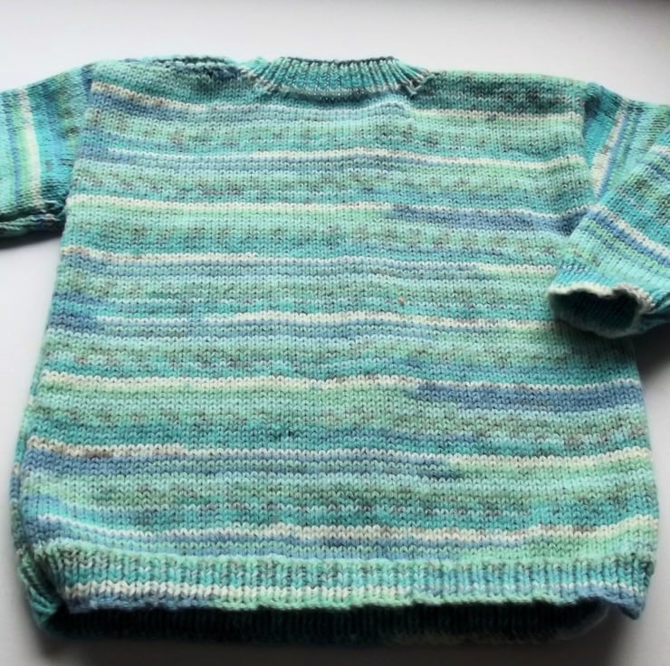 Hand knitted by me. Green and White Jumper. Round neck with 1 button closure. Knitted in fine weight acrylic blend yarn. hm102