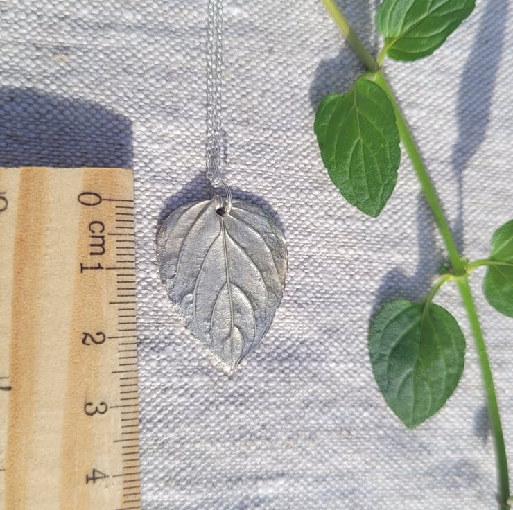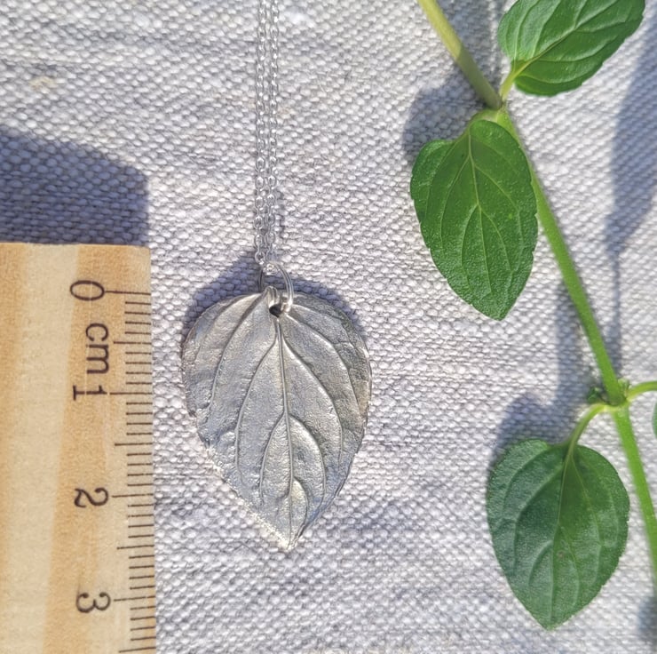 This silver necklace was made from a black peppermint leaf from my own garden, on the edge of my village in Berkshire. The intricate veins and details create a beautiful, unique pendant.