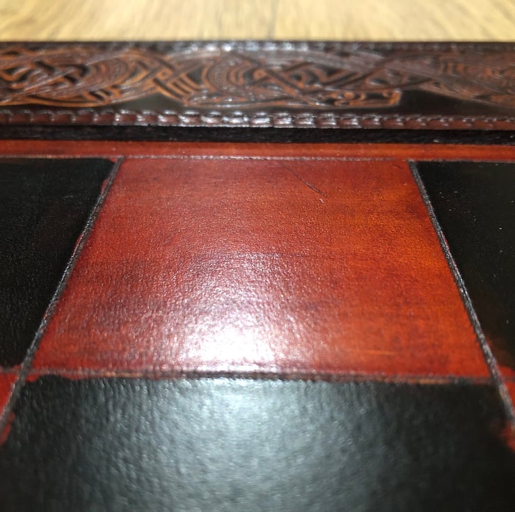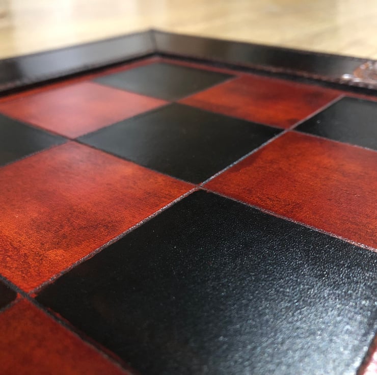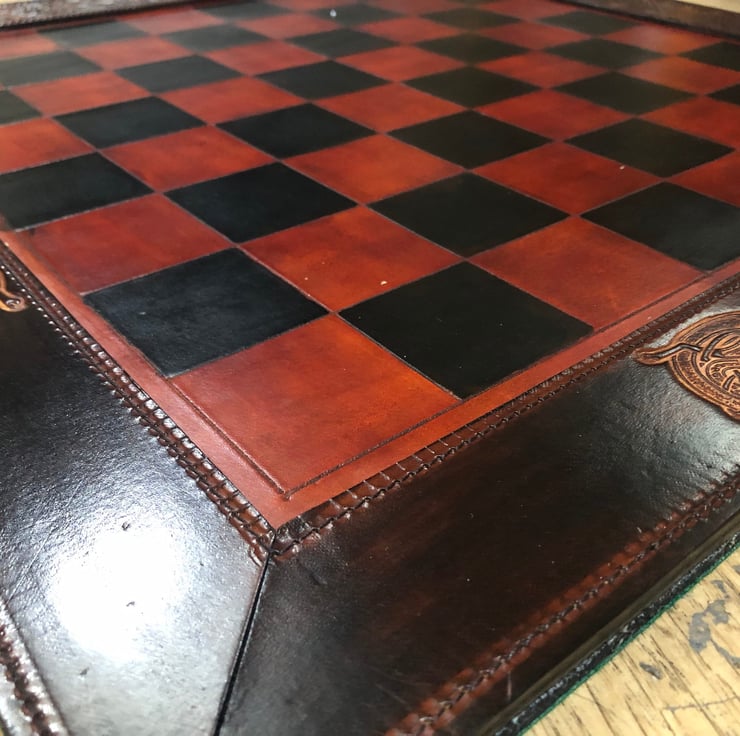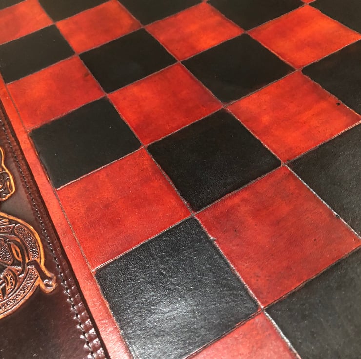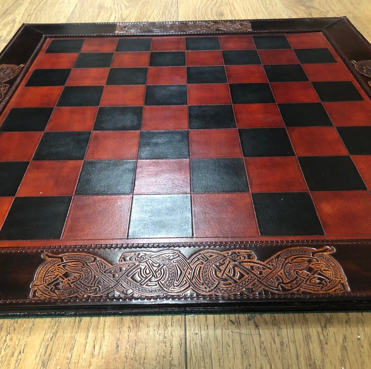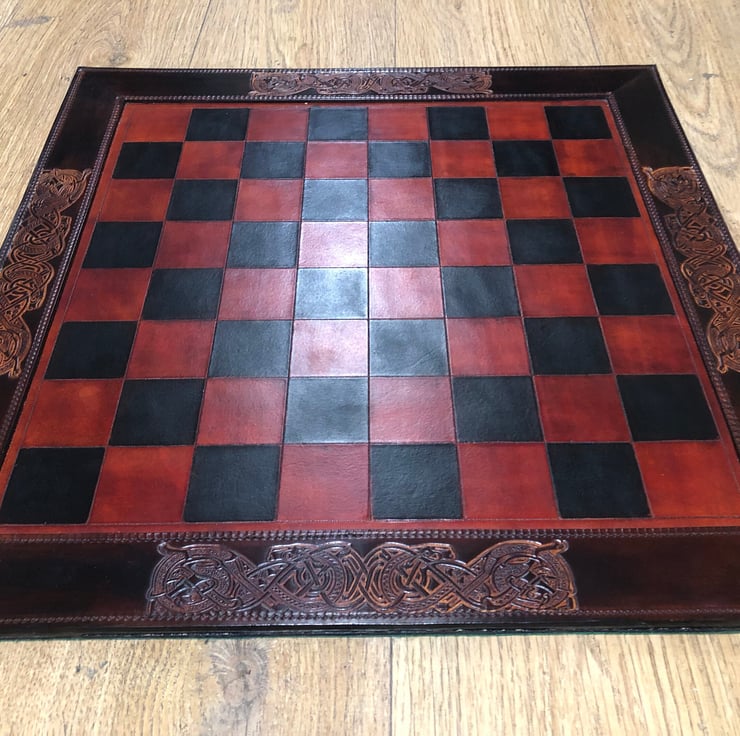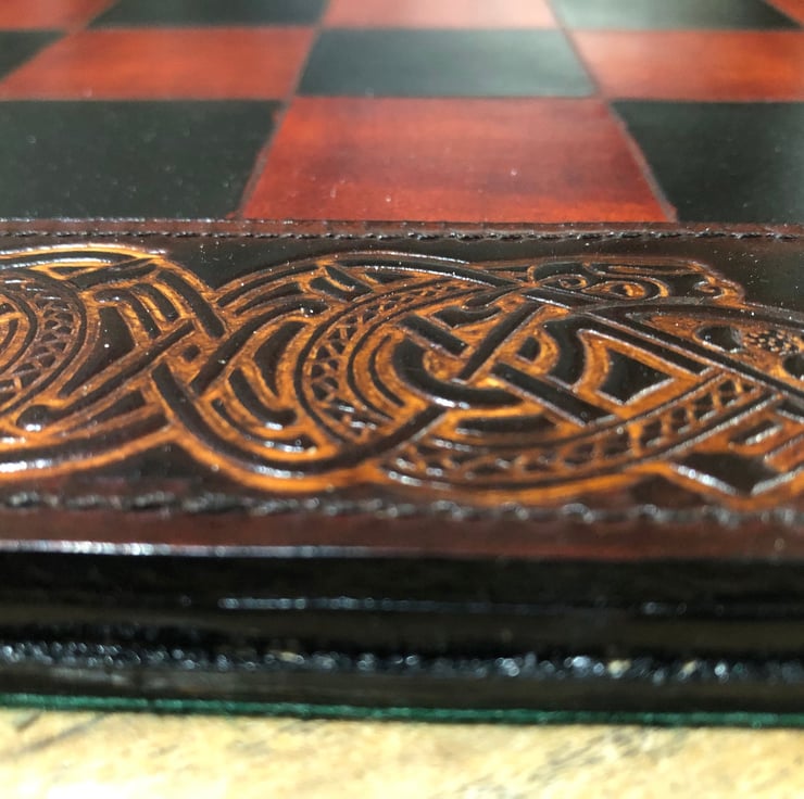 Introducing our exquisite Handmade Leather Chessboard with a captivating Celtic motif (Custom board sizes are available upon request). These boards are intricately crafted within a 6cm surround. This unique leather piece, measuring 59cm x 59cm and just under 1.5cm thick has a 5cm square and is comprised of 1cm thick high quality leather mounted on a sturdy 0.5cm thick hardboard, finished with a high grade 2mm thick felt base ensuring durability for endless chess battles.