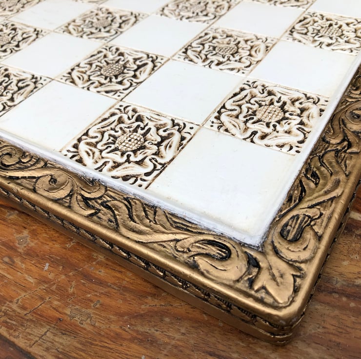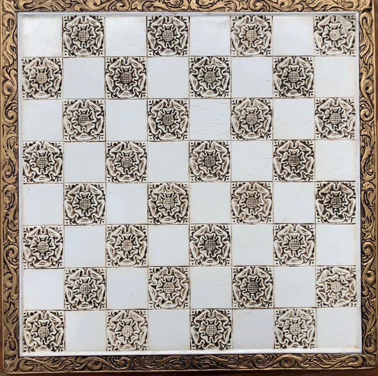 This listing is for a beautiful custom made rustic styled chess board based upon an old medieval York Rose design with a highly detailed engraved border.