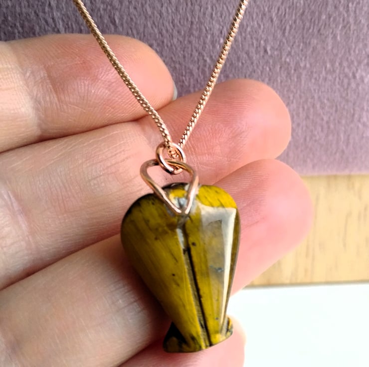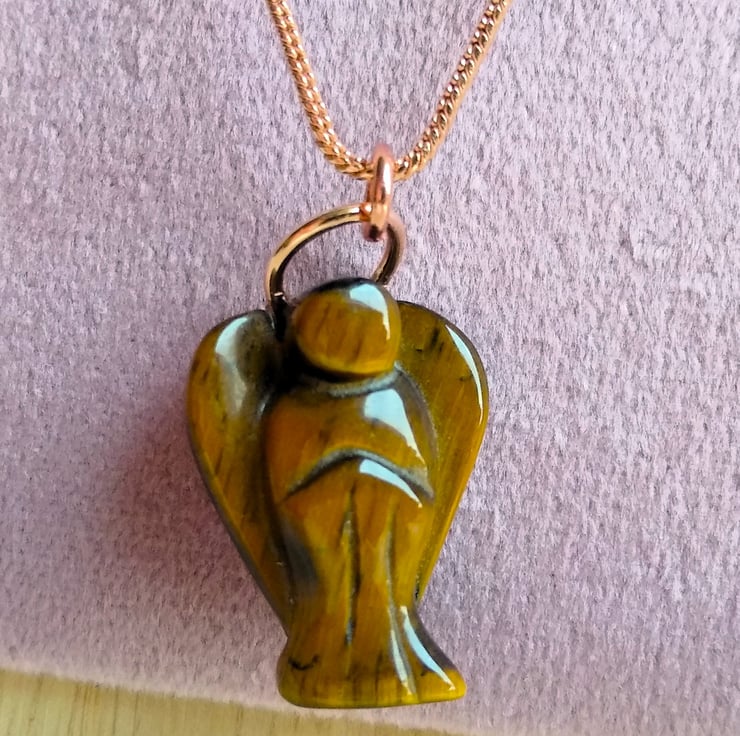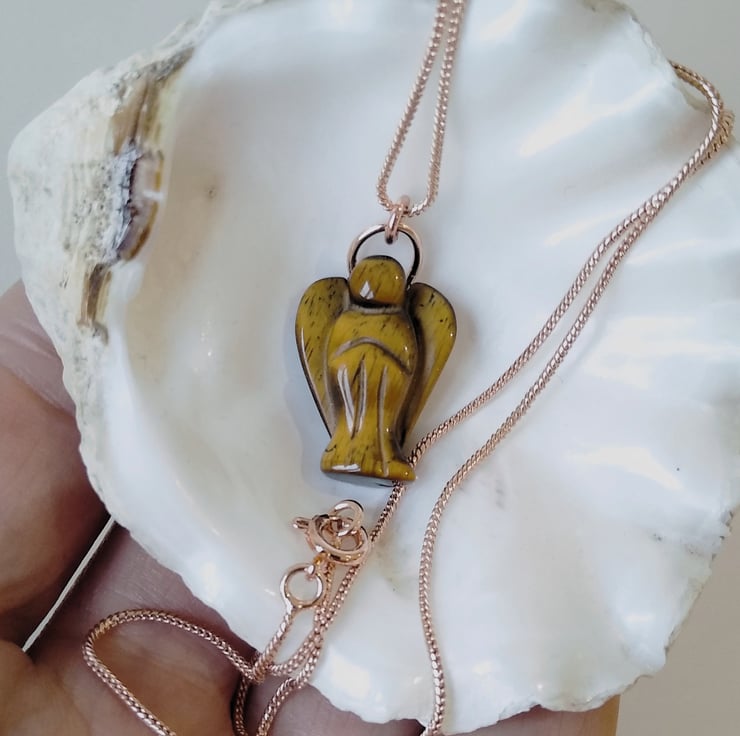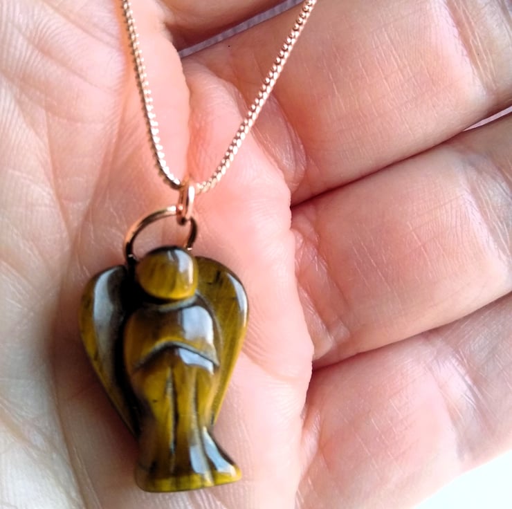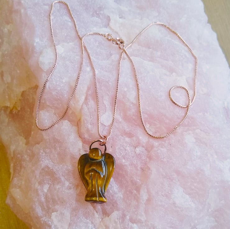 Carved from Tiger Eye stone and finished with a complimenting rose gold plated snake chain, length 18 inches. Your angel may provide you with a little extra strength and guidance for moments in life when you need a bit more courage or want to feel protected and safe.