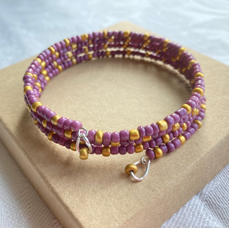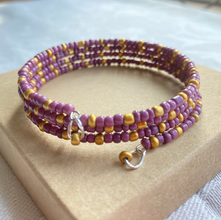 This wrap around bracelet is made with burgundy and gold seed beads.
