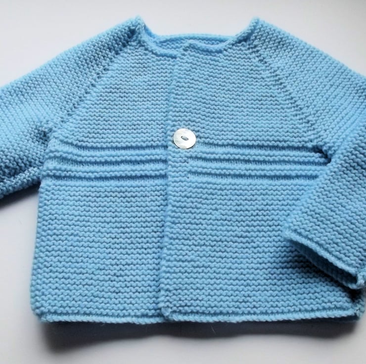 Hand knitted by me. Mid Blue Cardigan Jacket. Round neck with 1 shell button closure. Knitted in fine weight acrylic blend yarn. hm72