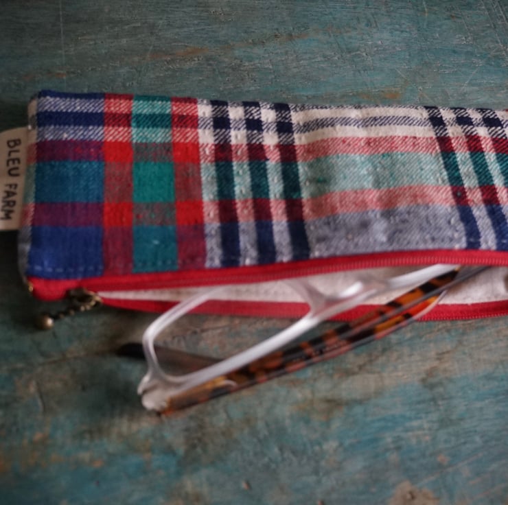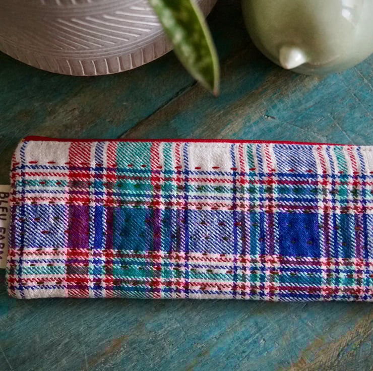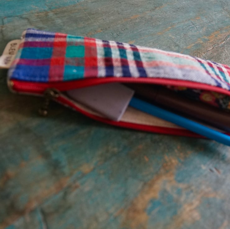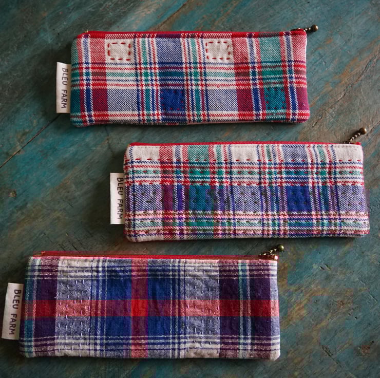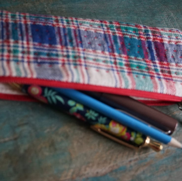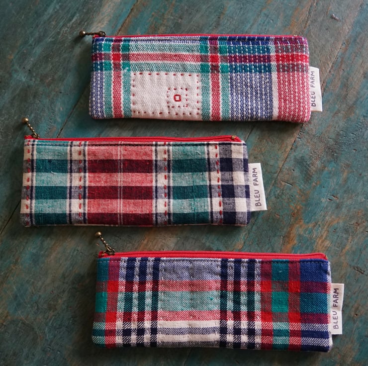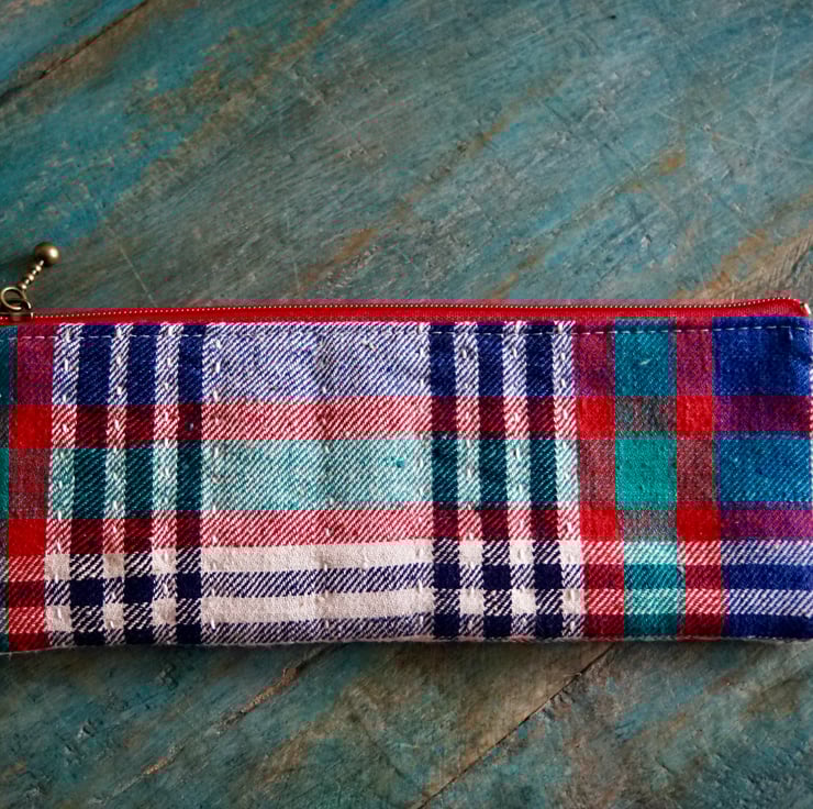 Brighten your desk or bag with this handmade slim pencil case. Crafted from selected vintage Chinese cotton fabrics with colourful tartan patterns and finished with my decorative hand stitches and a cheerful red zipper, every piece is one of a kind.