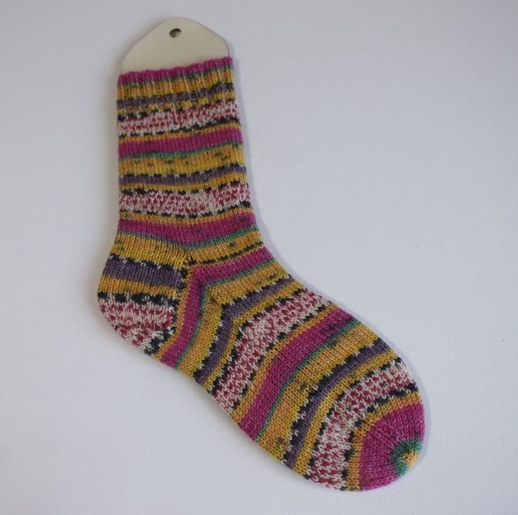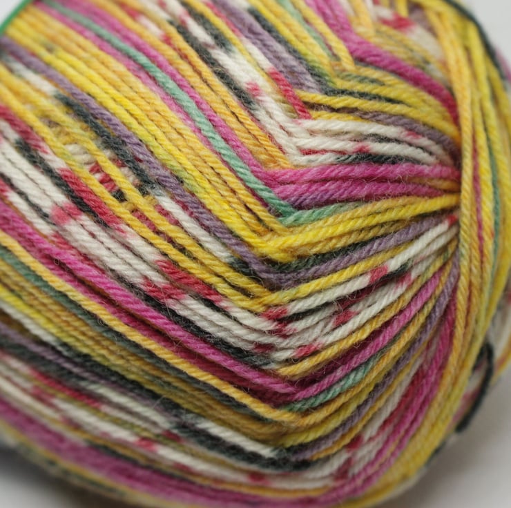 Princess - 7958 is a vibrant self patterning yarn with stripes of fading yellow, pink and natural with pink flecks boardered by thin stripes of green, dark mauve, yellow and natural and grey fleck pattern. A beautiful patterny yarn.