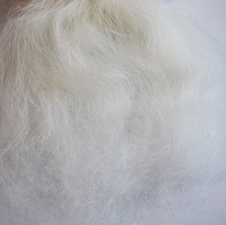 This long wool is silky and soft and easy to spin it is a creamy white with a sprinkling of darker fibres which gives it depth. It has a micron range of approximately 38-44microns and an average staple length of around150-380 mm. Nice to spin, dry or felt