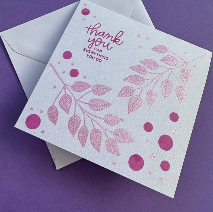 On a pastel lilac background with shimmery leaves in a pale pink and petals and the greeting in a deeper pinky purple this card is just beautiful to send someone to let them know your appreciation.