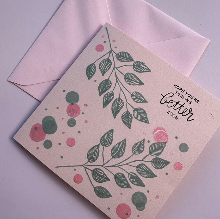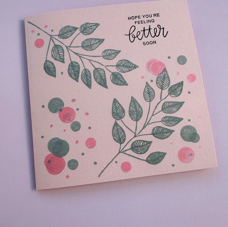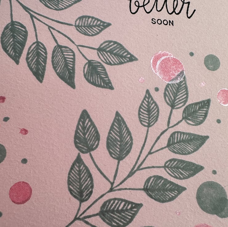 On a pastel pink background with dusky grey leaves and shimmery pink and grey petals this is a perfect card to send someone under the weather for whatever reason.