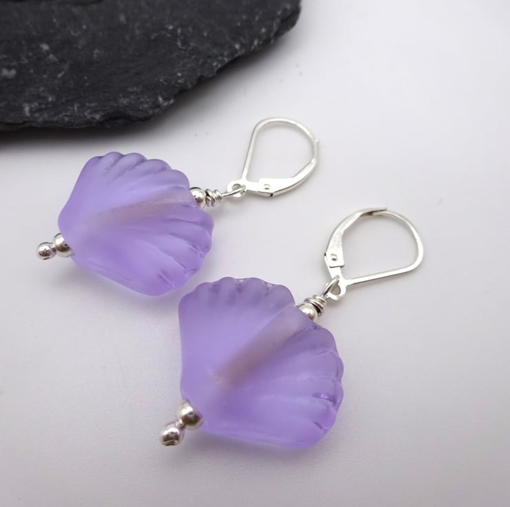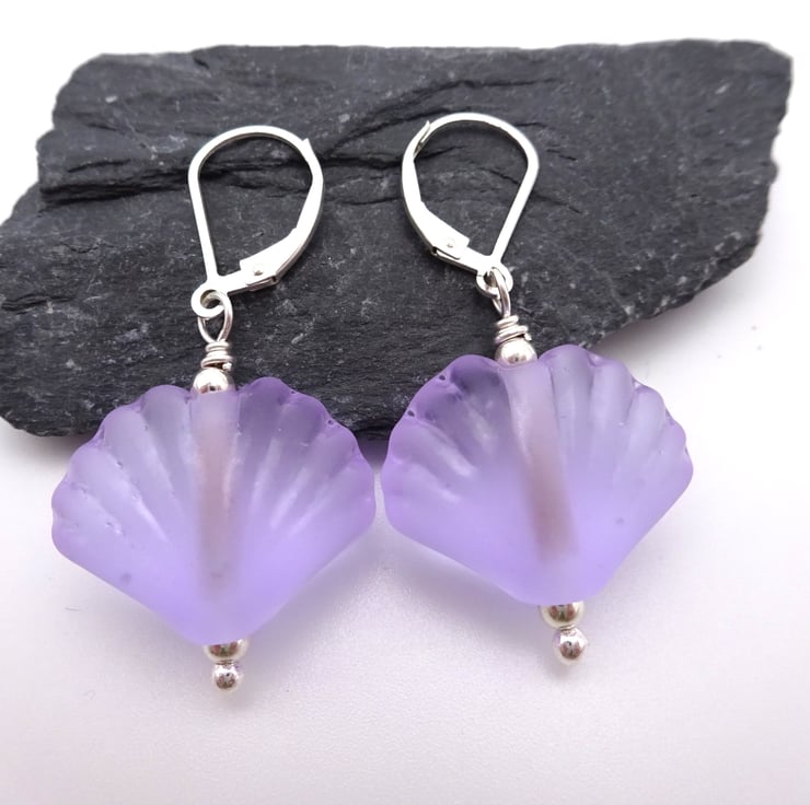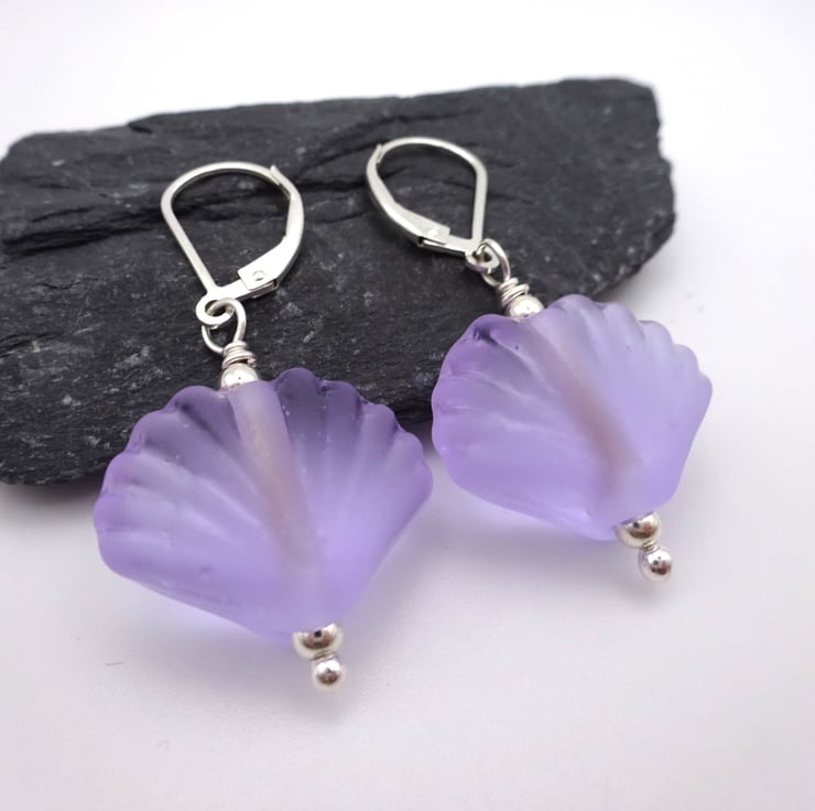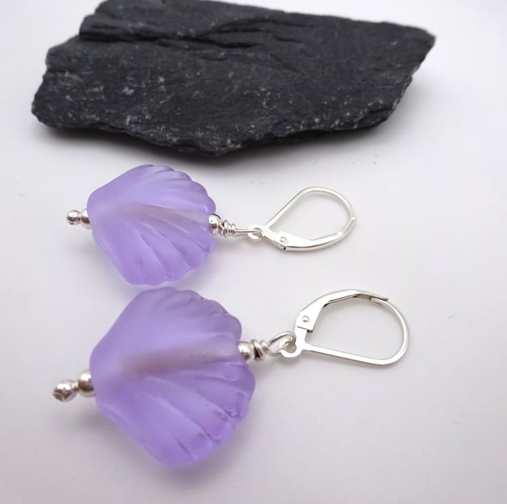 A pair of earrings made with sterling silver lever back ear wires, sterling silver beads and handmade lampwork glass sea shell beads made with lilac glass.