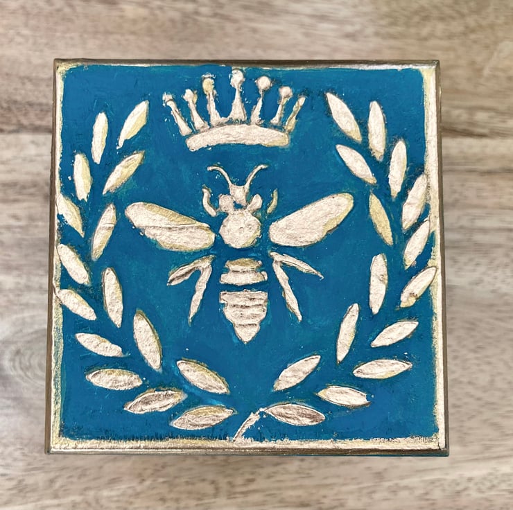 I have used a special modelling paste to render the lid with a Queen Bee logo and then painted this in gold leaf paint, so the image is slightly raised.