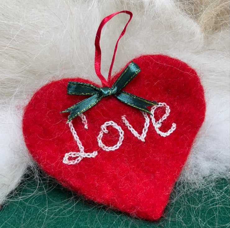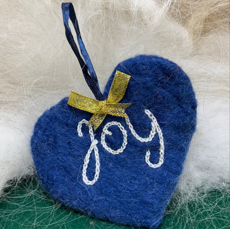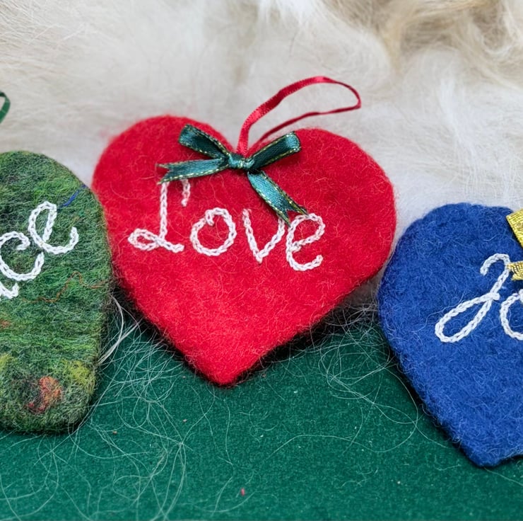 These are wet felted hearts that I have then hand embroidered with a festive theme. They would look great hanging on the tree. £4:50 is purchased separately or £12 for the set of three. For decorative purpose only.