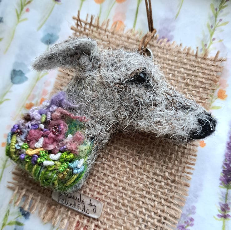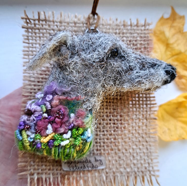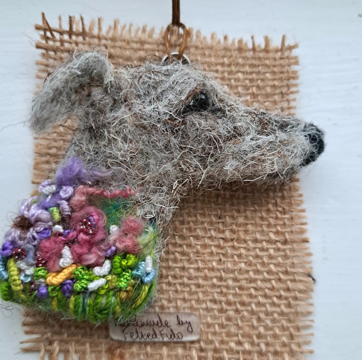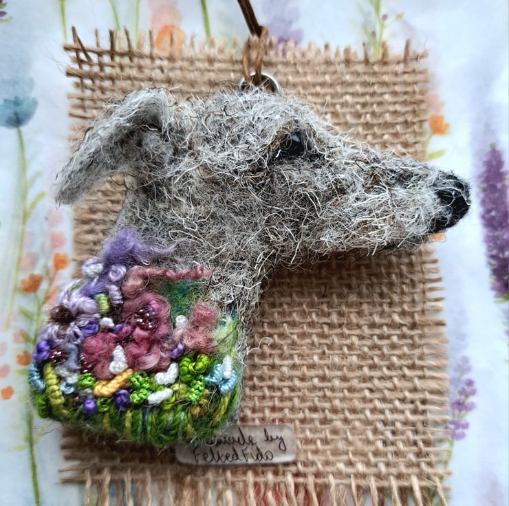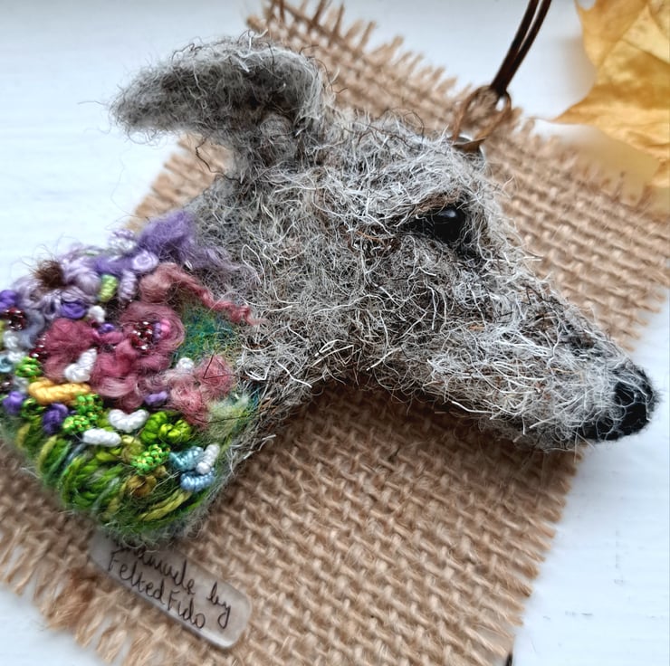 needle felted lurcher brooch,with embroidered details,approx 3 inches,metal brooch fitting to rear